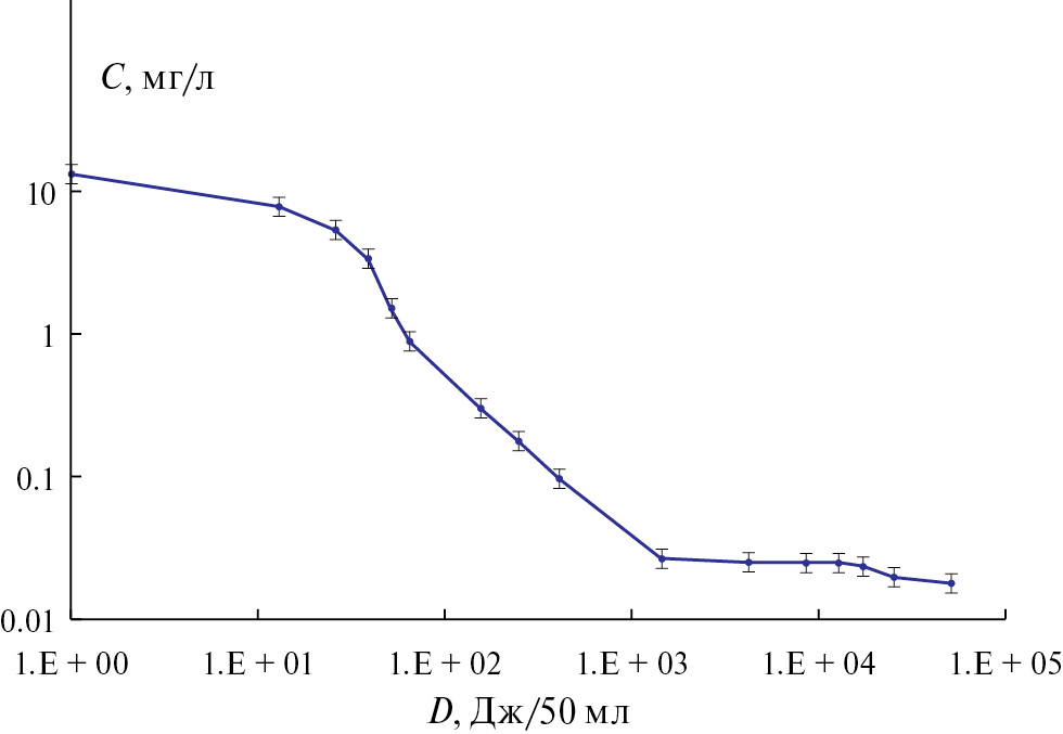 Зависимость концентрации фенола от дозы обработки озоно-гидроксильной смесью представлена на рис. 3. Из рис. 3 видно, что зависимость не является экспоненциальной. После обработки дозой 1400 ± 50 Дж/50 мл концентрация уменьшается, достигает значения 0.027 ± ± 0.005 мг/л и дальше с ростом дозы меняется слабо. Обработка дозами до 150 Дж/50мл осуществлялась в объеме 80 л, при больших дозах обрабатывался объем 50 мл. При дозе 5×104 Дж/50 мл концентрация фенола уменьшается только до 0.018 ± 0.005 мг/л. Причиной более медленного убывания концентрации фенола по сравнению с тетрациклином может быть протекание обратных реакций, которые особенно сильно сказываются при малых концентрациях фенола. Механизм окисления фенола под действием озона и гидроксильных радикалов различается. Озон не радикал, радикальные продукты не образуются [18], поэтому при окислении только озоном такого эффекта не наблюдается.