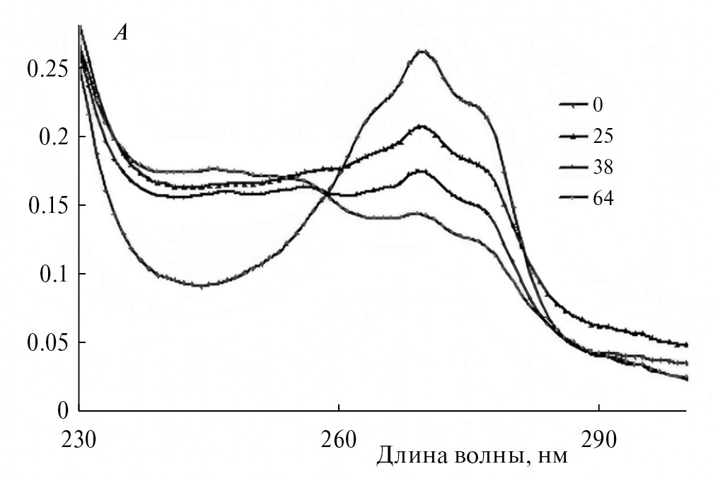 Рис. 4. Спектры поглощения раствора фенола (0 ‒ исходный) после обработки дозами 25, 38 и 64 Дж/50 мл.