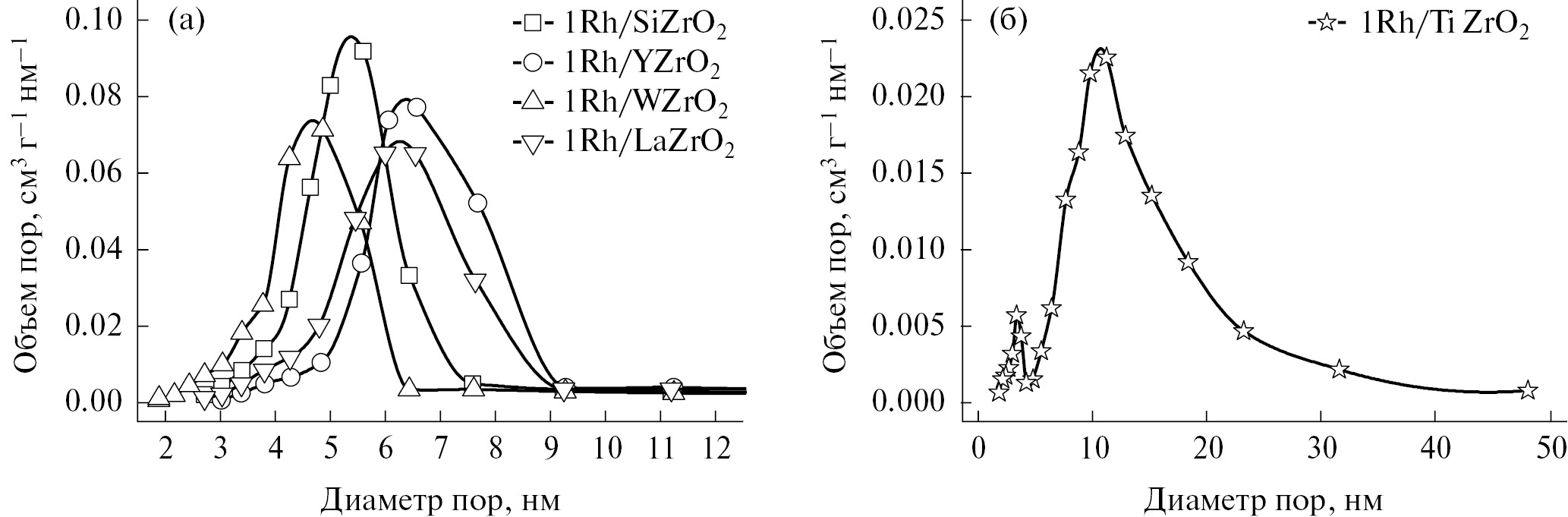 Рис. 1. Распределение пор по размерам для нанесенных катализаторов: а) 1Rh/SiZrO2, 1Rh/YZrO2, 1Rh/WZrO2, 1Rh/LaZrO2; б) 1Rh/TiZrO2