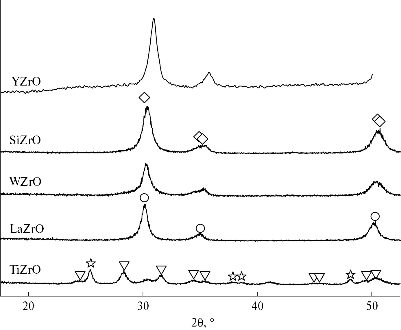 Рис. 2. Дифрактограммы образцов родийсодержащих катализаторов. Символами обозначены позиции рефлексов баз из базы ICDD: ∇ — бадделеит [00-037-1484], ◊ — тетрагональный диоксид циркония [00-050-1089], ○ — кубический диоксид циркония [00-049-1642], ∗ — анатаз [00-021-1272]