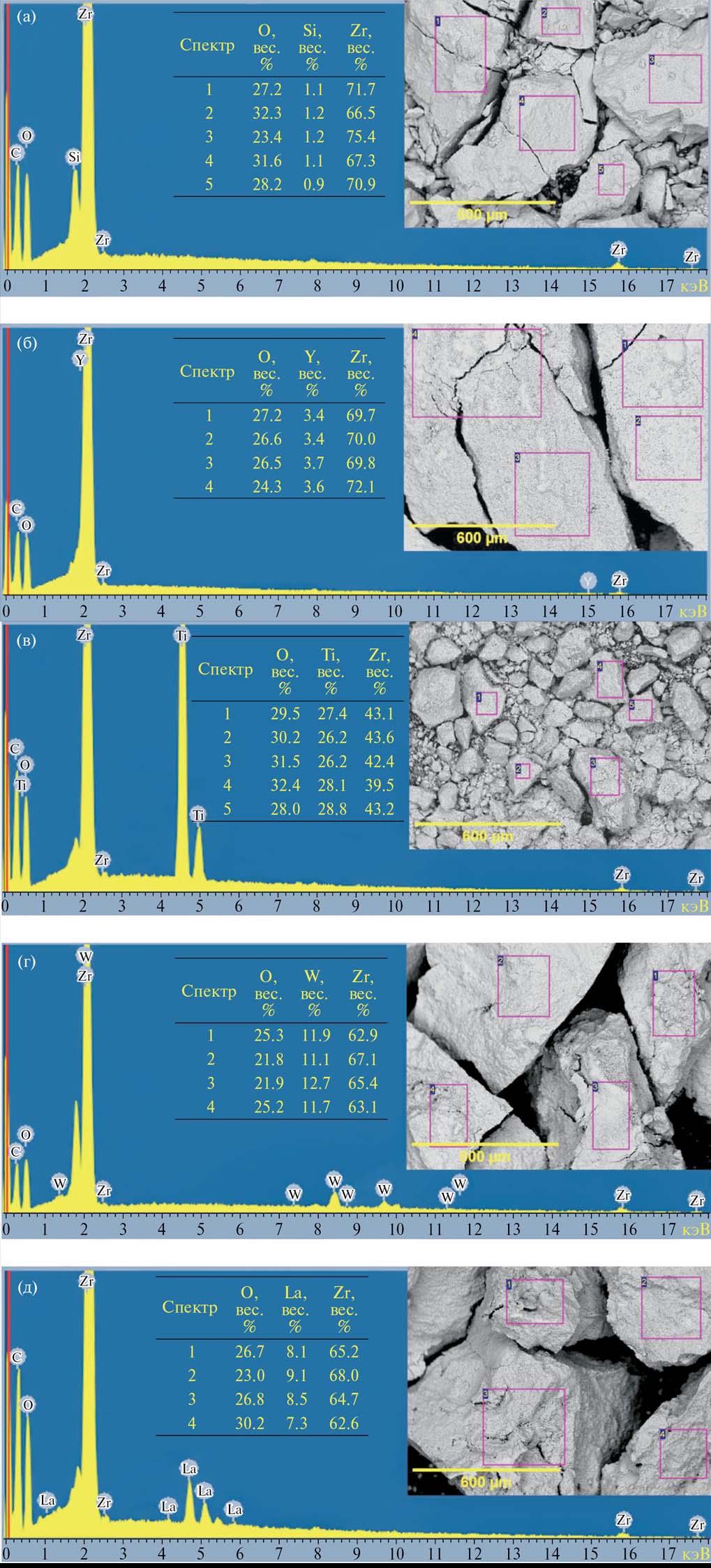 Рис. 3. Энергодисперсионные спектры, микрофотографии СЭМ и элементный состав по областям для образцов носителей на основе диоксида циркония: SiZrO2 (а), YZrO2 (б), TiZrO2 (в), WZrO2 (г), LaZrO2 (д)