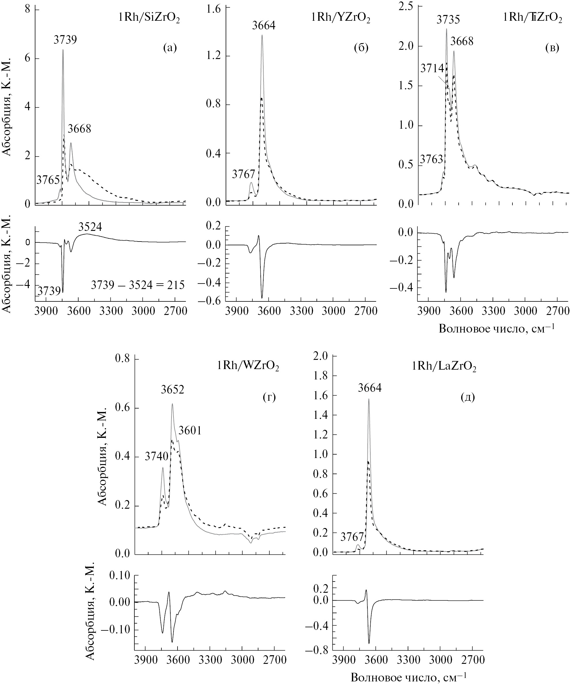 Рис. 4. ИК-спектры диффузного отражения образцов катализаторов: 1Rh/SiZrO2 (а), 1Rh/YZrO2 (б), 1Rh/TiZrO2 (в), 1Rh/WZrO2 (г), 1Rh/LaZrO2 (д) в области гидроксильных групп. Сплошные линии – после вакуумной обработки при 400 °С, пунктирные линии – после адсорбции CD3CN. Нижний ряд – разностные кривые