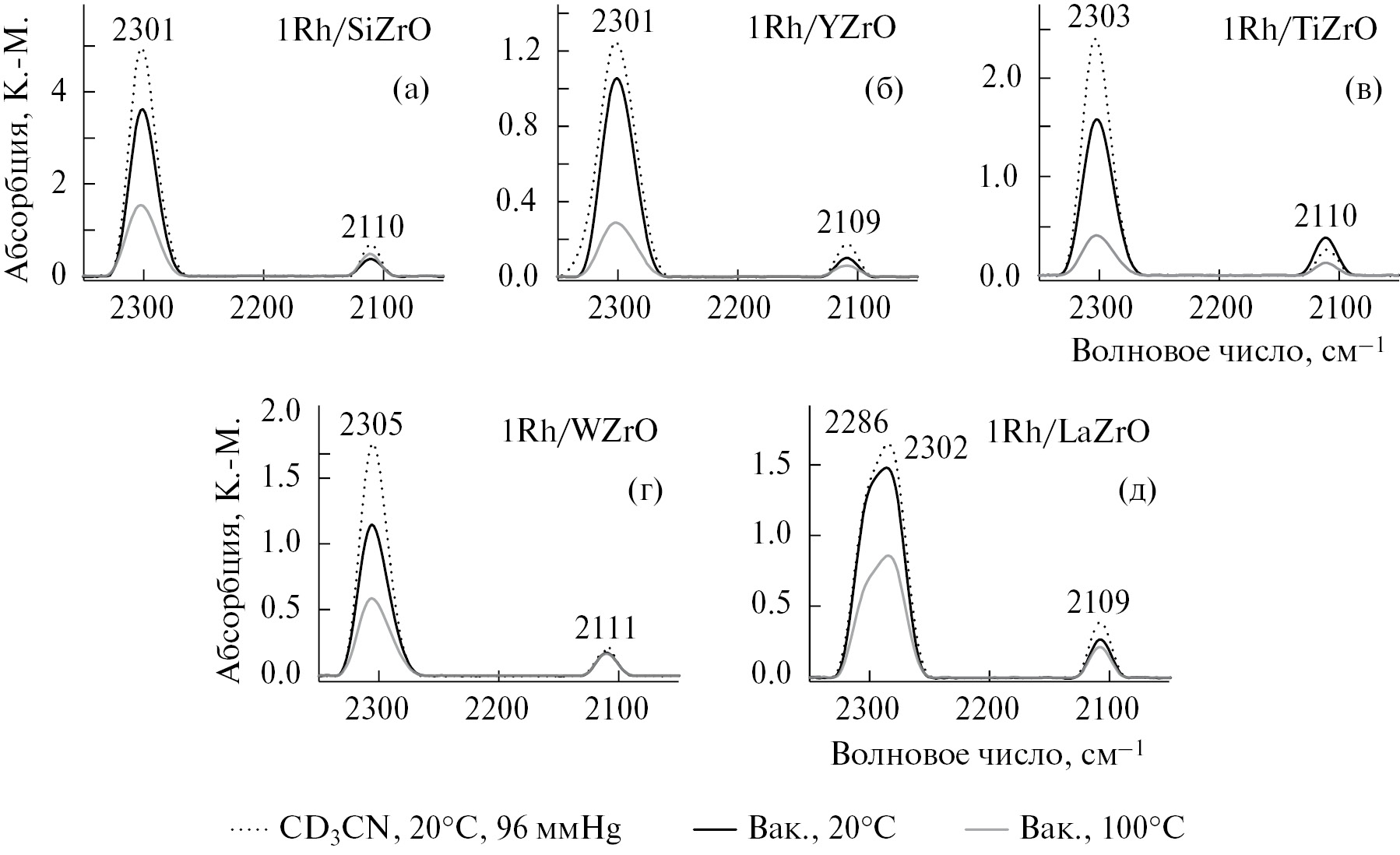 Рис. 5. ИК-спектры диффузного отражения образцов родийсодержащих катализаторов: 1Rh/SiZrO2 (а), 1Rh/YZrO2 (б), 1Rh/TiZrO2 (в), 1Rh/WZrO2 (г), 1Rh/LaZrO2 (д) в условиях адсорбции-десорбции CD3CN (96 ммHg) (точечная линия), вакуумированных при 20 °C (черная кривая) и при 100 °C (серая кривая)
