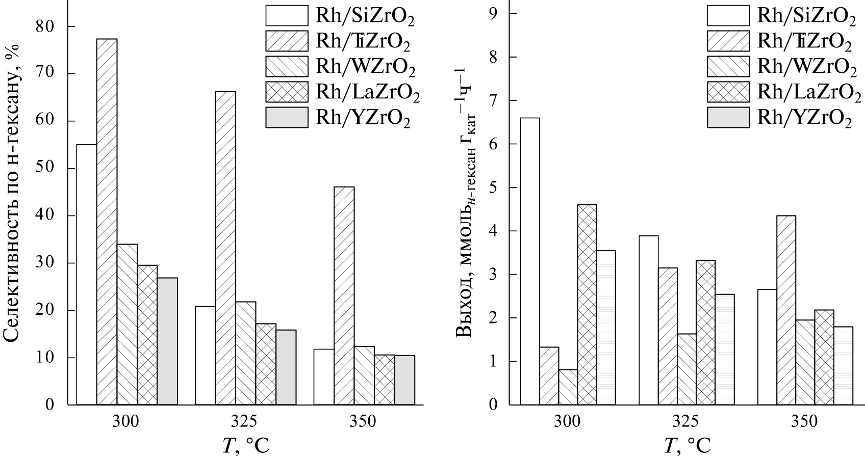 Таким образом, несмотря на то что наибольшую селективность по целевому продукту показывает образец 1Rh/TiZrO2, из-за низкой конверсии циклогексана выход по н-гексану оказывается небольшим. В области более высоких температур соотношение производительностей образцов меняется, и при 350 °С наибольший выход демонстрирует образец 1Rh/TiZrO2, что обусловлено ростом конверсии при умеренном падении селективности по н-гексану.
