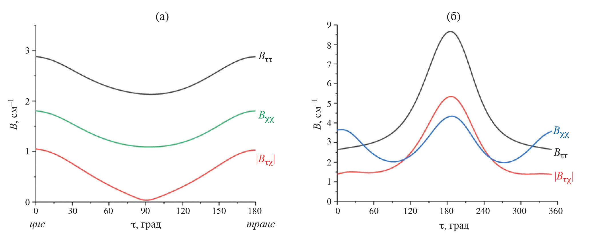 На рис. 4 показано, как меняются величины B(τ, χ) при движении вдоль пути минимальной энергии, отвечающему внутреннему вращению, т. е. зависимость от τ. Из рисунка видно, что для молекулы CB1CA во всей области изменения t модуль перекрестного члена |Bτχ|, отвечающего за взаимосвязь движений, всегда заметно меньше Bττ и Bχχ. Однако |Bτχ| принимает максимальные значения при равновесных геометрических параметрах и минимальное – вблизи точки, отвечающей барьеру внутреннего вращения.