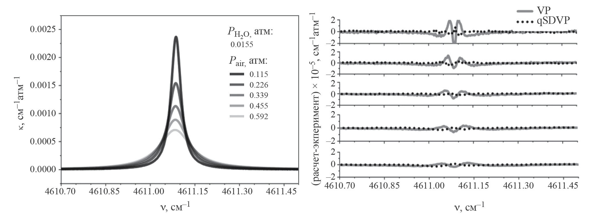 В спектральной области 4500–4700 см–1 определены параметры для 180 линий поглощения молекулы воды, большинство из которых принадлежат колебательно-вращательной полосе 3ν2. Пример аппроксимации для одной из исследованных линий поглощения молекулы воды с помощью двух моделей формы контура (V и SDV) показан на рис. 2. Панель справа показывает разность между экспериментальными и рассчитанными спектрами для этих профилей. Из рис. 2 следует, что рассчитанные спектры хорошо совпадают с экспериментальными при аппроксимации SDV контуром – на графиках отклонений видна лишь шумовая компонента экспериментального сигнала. Среднеквадратичное отклонение при использовании V контура равно 1.74 × 10–6 см–1 атм–1, а SDV профиля – 7.11 × 10–7 см–1 атм–1.