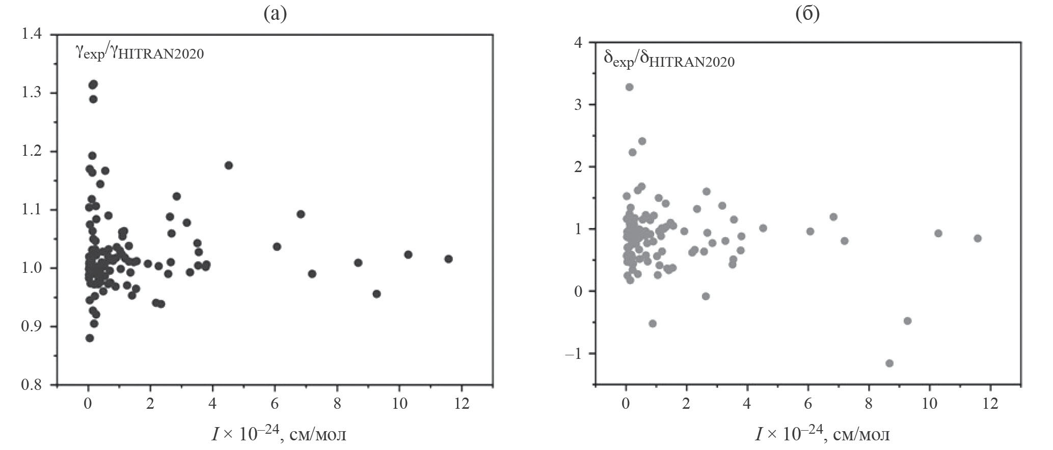 Базы спектроскопической информации HITRAN и GEISA [3, 4] достаточно часто используются для расчетов пропускания атмосферы Земли, поэтому представляет интерес сравнение полученных параметров линий поглощения молекулы воды с данными из [3]. Положения центров линий поглощения молекулы воды в исследуемом спектральном интервале определены хорошо. Согласно “reference code” базы HITRAN они представлены результатами двух работ [9, 10], данные из [9] соответствуют наиболее сильным линиям. Значения интенсивностей представлены вариационными расчетами из работ [11, 12], а коэффициенты уширения и сдвига линий поглощения молекулы воды, уширенных давлением атмосферного воздуха, – экспериментальной работой [13] и расчетами авторов [14]. На рис. 3 и 4 показано сравнение интенсивностей, коэффициентов уширения и сдвига линий поглощения H2O, уширенных давлением атмосферного воздуха. Из рис. 3 следует, что измеренные интенсивности хорошо согласуются со значениями из [3], так среднее значение отношение интенсивностей составило <Sданная работа/SHITRAN> = 0.996±0.009. Для коэффициентов уширения и сдвига наблюдаются некоторые отличия: отношения γданная работа/γ[3] и δданная работа/δ[3] меняются от 0.88 до 1.315 и от –16.143 до 7.151 соответственно, среднеквадратичное отклонение равно <γданная работа/γ[3]> = 1.028±0.074.