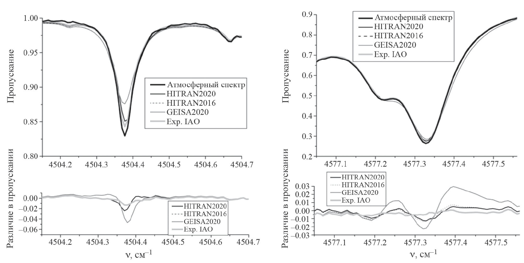 На рис. 6 приведены спектральные интервалы, в которых наблюдаются заметные различия между измеренным атмосферным солнечным спектром и модельными спектрами, вычисленными с использованием HITRAN2020, HITRAN2016, GEISA2020 и нашими данными. Как видно из рис. 6, лучшее согласие между измерениями и модельным спектром в областях около 4504.4 см–1 и 4577.3 см–1 было при использовании наших данных по линиям поглощения Н2О. Также достаточно хорошо согласуются с атмосферными измерениями результаты, полученные с использованием линий Н2О из HITRAN2020.