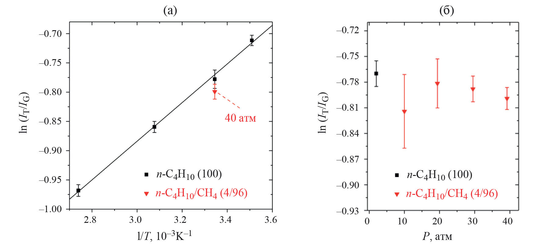 где и – суммарные интенсивности полос транс- и гош-конформеров н-бутана в спектре. Согласно полученной зависимости (рис. 3а), величина энтальпии перехода транс–гош составляет 657±66 кал/моль (доверительная вероятность 95%), что согласуется с наиболее поздними теоретическими (647±7 кал/моль) и экспериментальными (660±22 кал/моль) исследованиями [10, 11]. Ошибка измерения обусловлена шумом в экспериментальных спектрах, вариацией перекрытия полос конформеров, вносимым вкладом неучтенных горячих полос, а также зависимостью самой величины энтальпии от температуры среды [11, 18, 27]. Как показано на рис. 3, отношение интенсивностей транс/гош в случае смеси н-бутана с метаном при высоком давлении немного ниже по сравнению с чистым н-бутаном при комнатной температуре. Смещение отношения при давлении 40 атм эквивалентно концентрациям конформеров в чистом н-бутане при температуре 307 К и давлении 2 атм. Однако, мы полагаем, что наблюдаемое изменение отношения может быть вызвано не столько конформационным перераспределением, сколько вносимой систематической погрешностью за счет уширения полос с ростом давления.