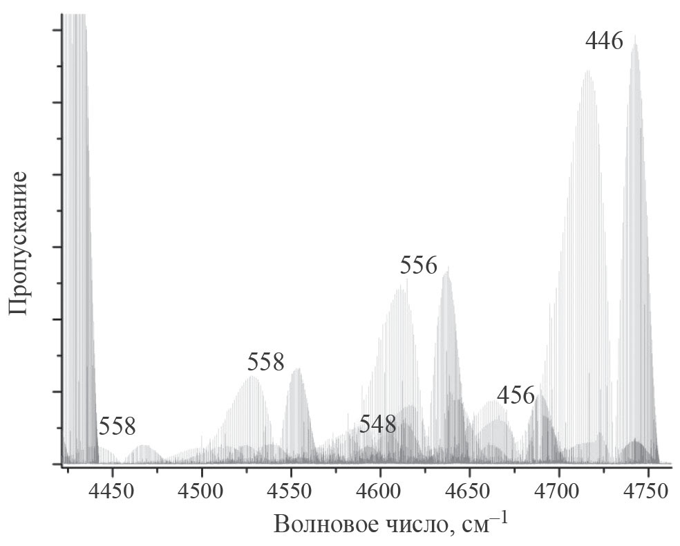 Рис. 1. Состав записанного спектра в области 4400–4800см–1. Указана полосы 2ν3 14N216O (446), 15N218O (558), 15N216O (556), 14N15N16O (456) и 15N14N18O (548)