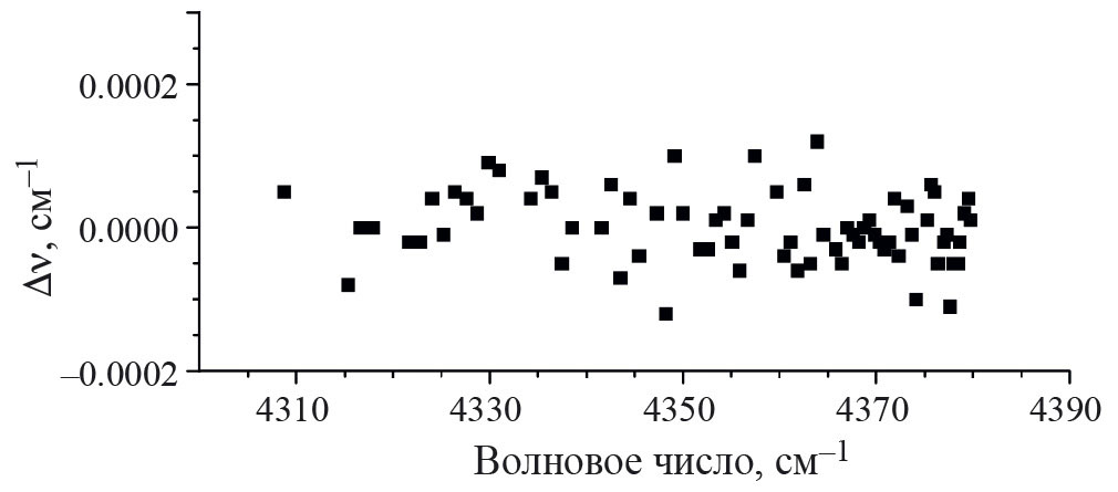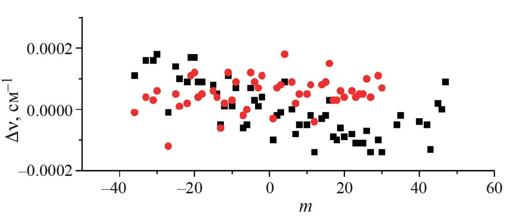 Частотная шкала фурье-спектрометра калибровалась по положениям 84 линий H216O в области 4000–6000 см–1 с интенсивностями более 3×10–25 см/молекулу. Положения линий взяты из работы [1]. Отклонение калиброванных центров линий от данных в базе данных HITRAN [1] не превышало 0.0003 см–1, что определяет точность измерений фурье-спектрометра. Дополнительная проверка точности измерений центров линий была проведена с помощью наиболее точных измерений линий поглощения NNO, выполненных в последнее время. На рис. 2 показаны различия между наблюдаемыми и расчетными значениями положения линий в зависимости от квантового числа m, где m = –J для P-ветви и m = J + 1 для R-ветви полосы 448. Отличие измеренных центров линий 448 от данных работы [3] не превышает 0.0003 см–1, что и определяет погрешность измерений центров линий на данном спектрометре.