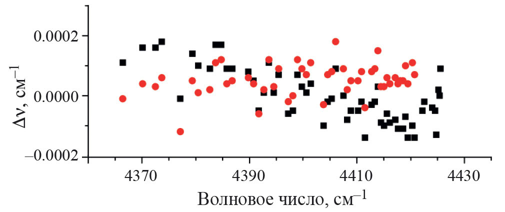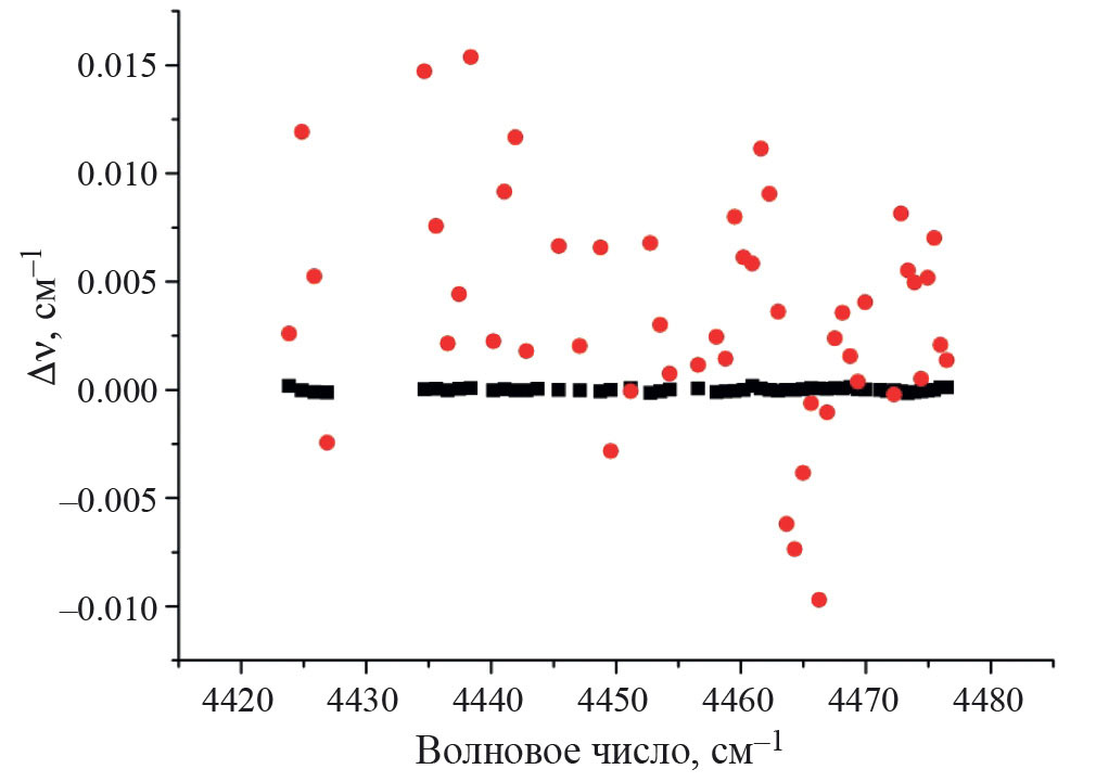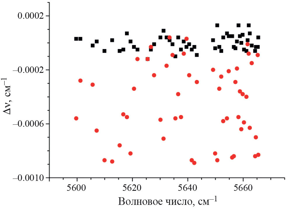 Рис. 4. Отличие измеренных центров линий полосы ν1 + 2ν2 + ν3 изотополога 15N15N18O в данной работе (черные квадраты) и измерений работы [7] (красные кружки) от рассчитанных значений