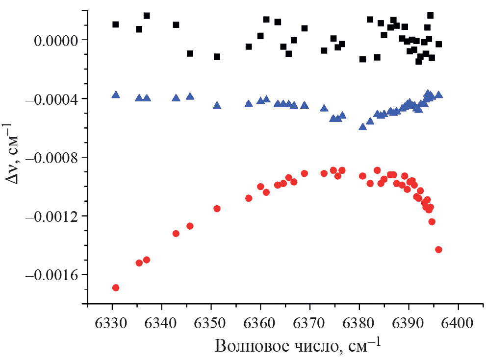 Рис. 9. Отличие измеренных центров линий полосы 3ν3 изотополога15N15N16O в данной работе (черные квадраты), измерений работы [13] (красные кружки) и [9] (синие треугольники) от рассчитанных значений