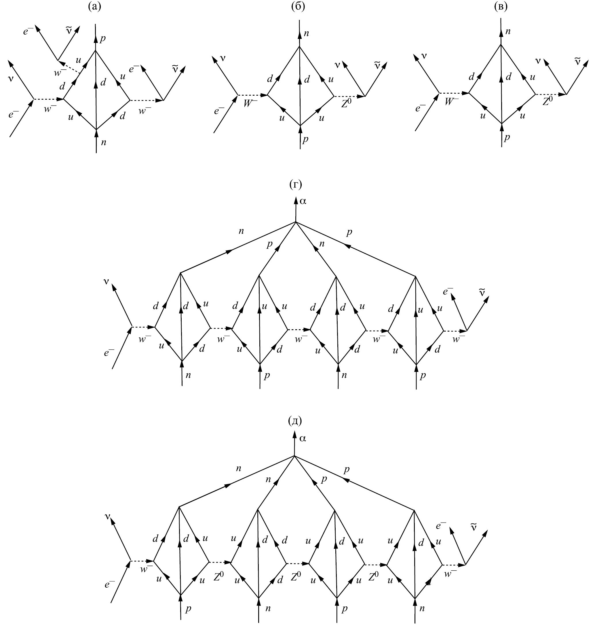 Рис. 1. Фейнмановские диаграммы инициируемого β–-распада (a), β+ распада (б), К-захвата (в) и инициируемого α-распада (г, д)