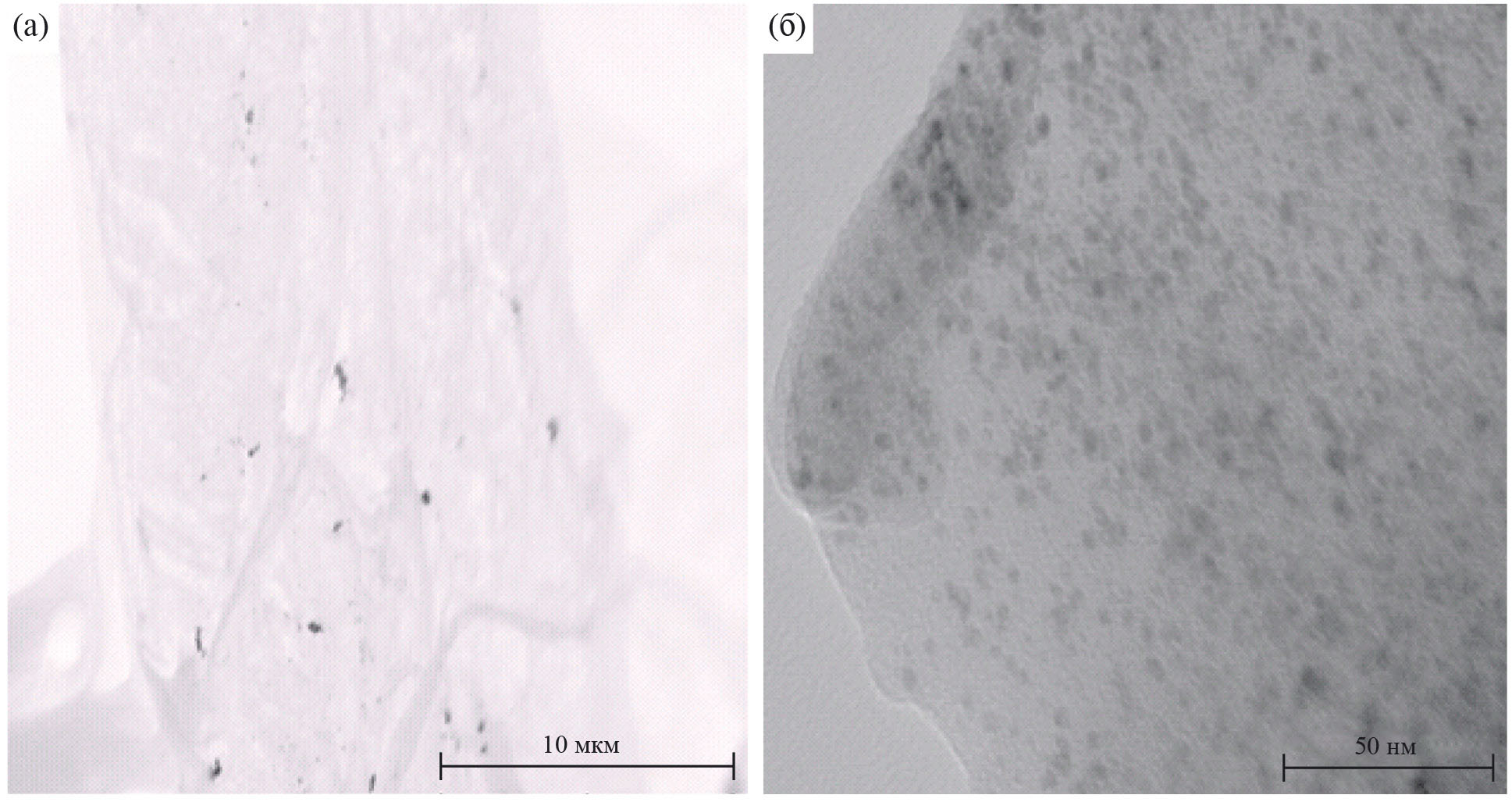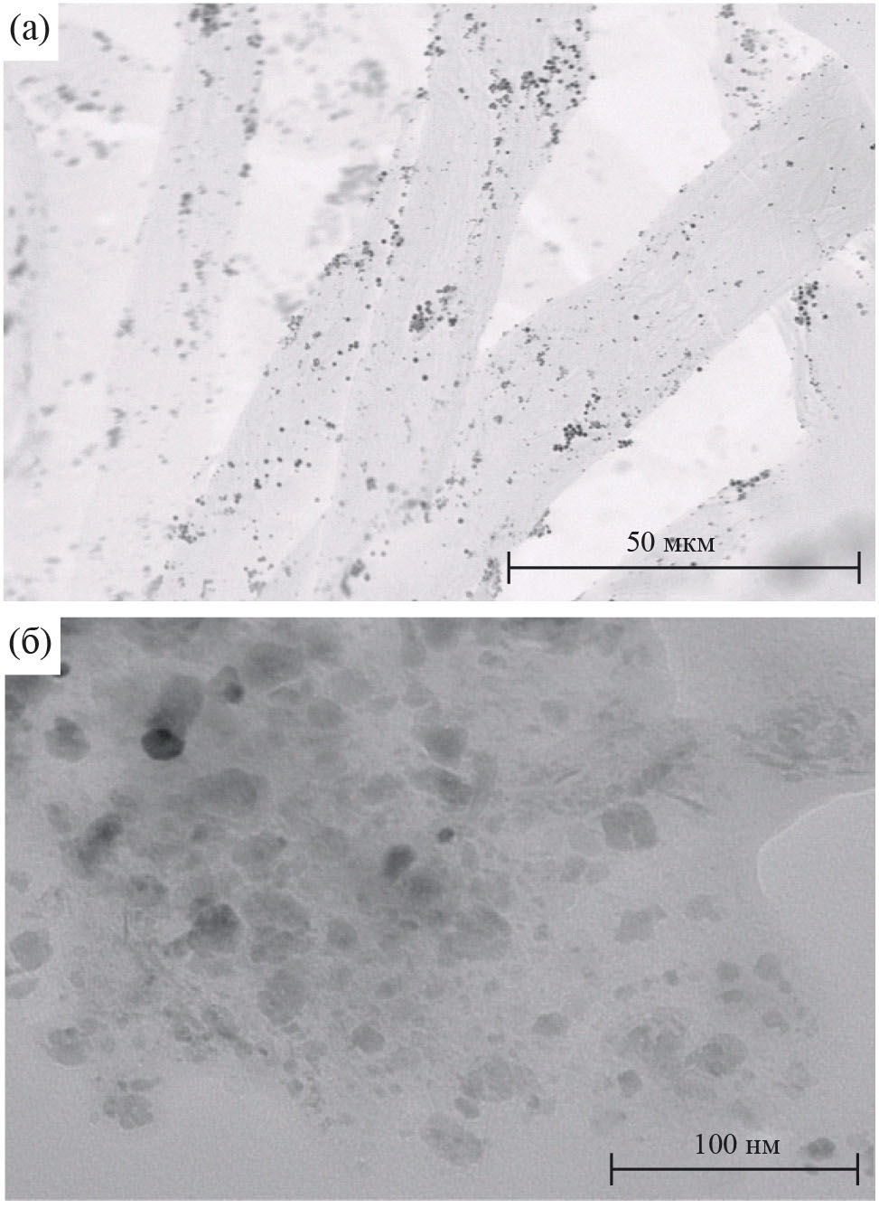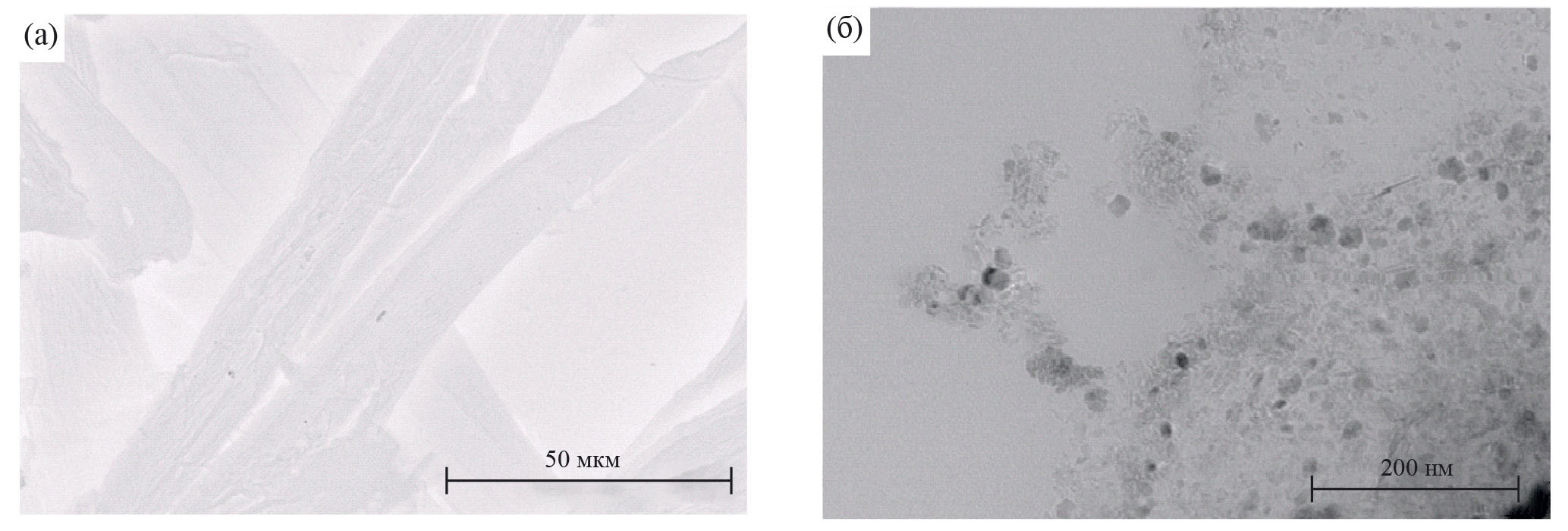 Рис. 1. Микрофотографии нанофибриллярной целлюлозы, полученные с помощью СЭМ (а) и ПЭМ (б)