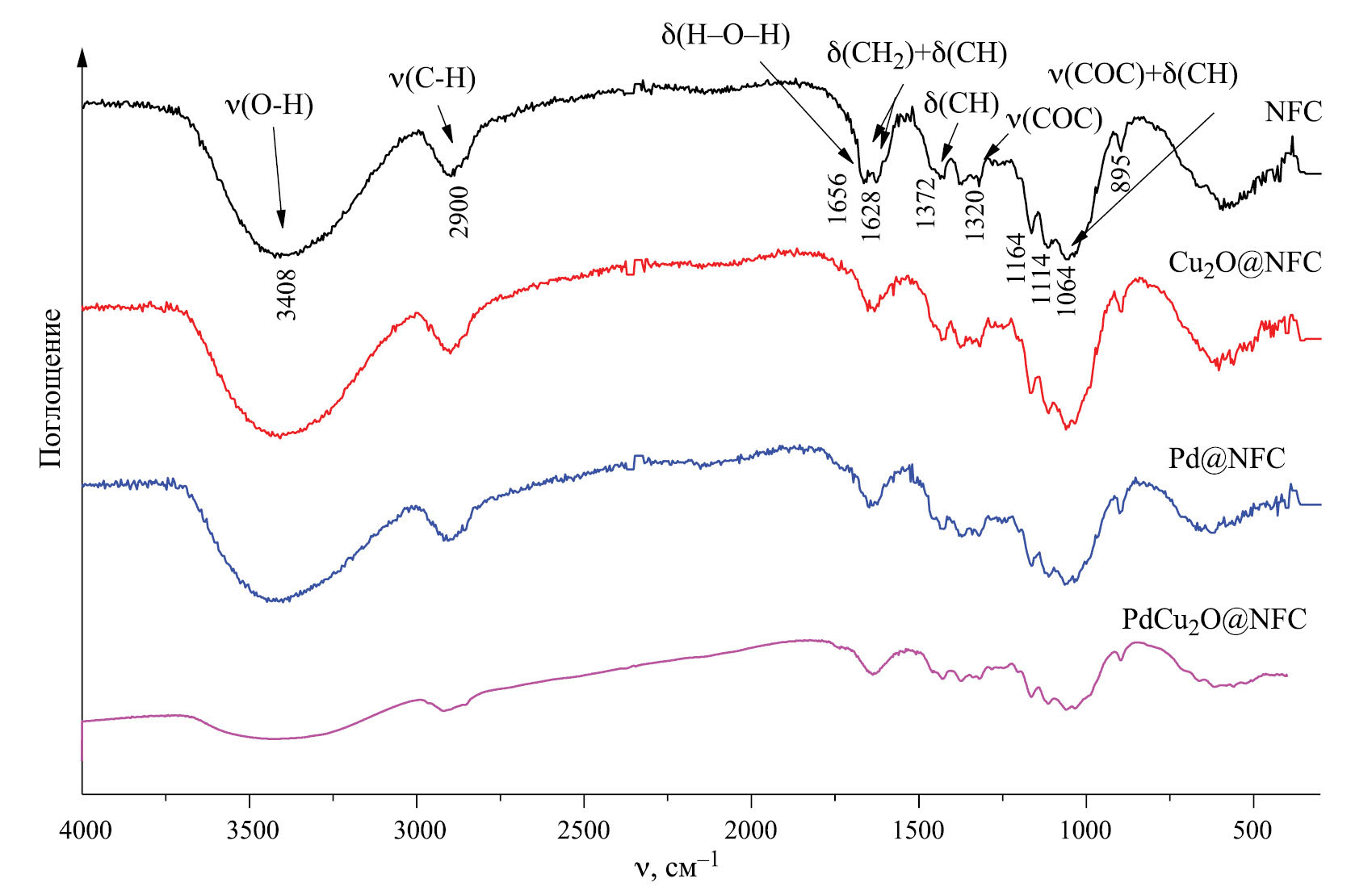 Рис. 3. ИК-спектры образцов: NFC, Cu2O@NFC, Pd@NFC, PdCu2O@NFC; ν – волновое число