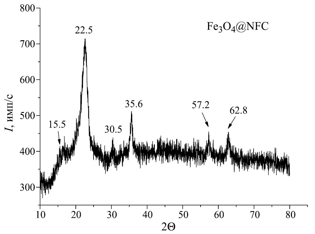 Наночастицы магнетита, полученные путем соосаждения из солей хлоридов железа (II) и (III), до введения их в NFC имеют средний размер области когерентного рассеяния 14.9 нм, вычисленный по формуле Дебая-Шеррера. На дифрактограммах нанокомпозитов Fe3O4@NFC присутствуют рефлексы при 2Θ = 30.5°, 35.6°, 57.2°, 62.8°, соответствующие магнетиту, и рефлексы при 2Θ = 15.5° и 22.5°, соответствующие кристаллической фазе целлюлозы (рис. 4).