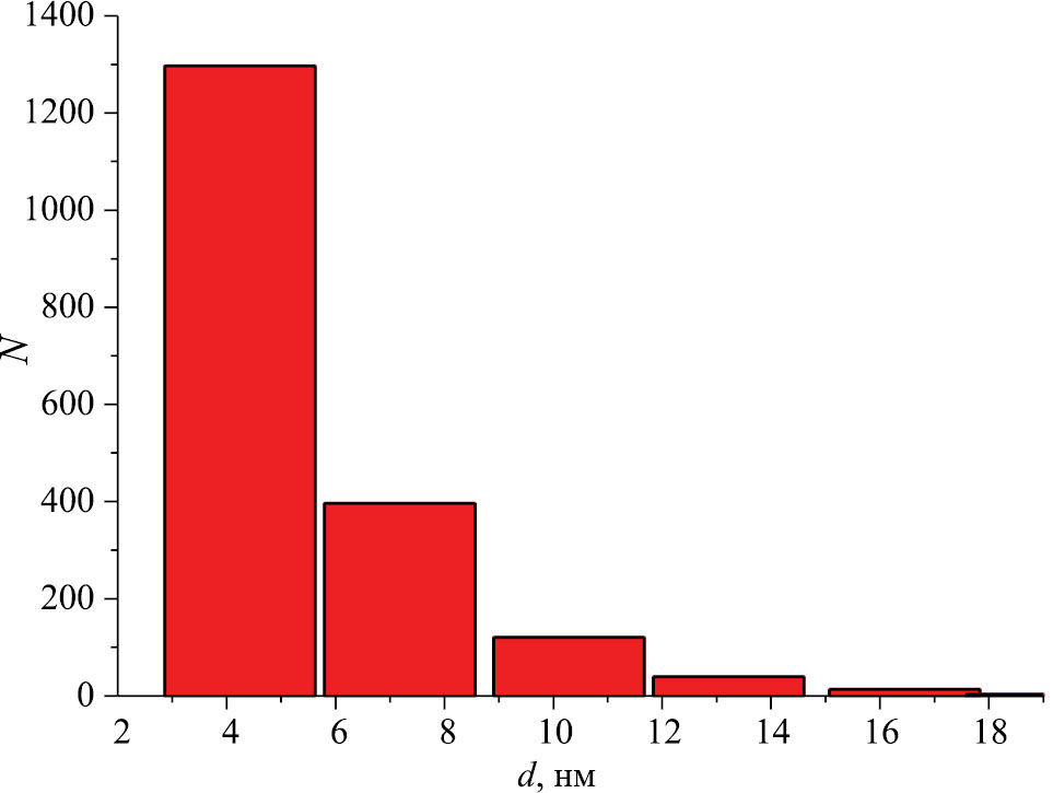 Дифрактограммы полученных образцов Cu2O@NFC (рис. 2) подтверждают образование наночастиц оксида меди (I) и сохранение структуры наноцеллюлозы. По данным СЭМ (рис. 6а) видно сохранение структуры волокон наноцеллюлозы и внедренные округлые агломераты размером 150–800 нм, но из снимков ПЭМ (рис. 6б) следует, что они состоят из округлых наночастиц c распределением размеров в диаметре от 4 до 15.5 нм (рис. 7).