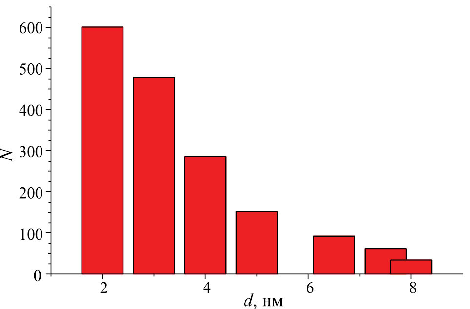 Снимки ПЭМ (рис. 8б) свидетельствуют об образовании отдельных зернышек – частиц палладия в матрице (120×130 нм) наноцеллюлозы. Размер частиц палладия составляет от 2.5 нм до 8.5 нм (рис. 9).