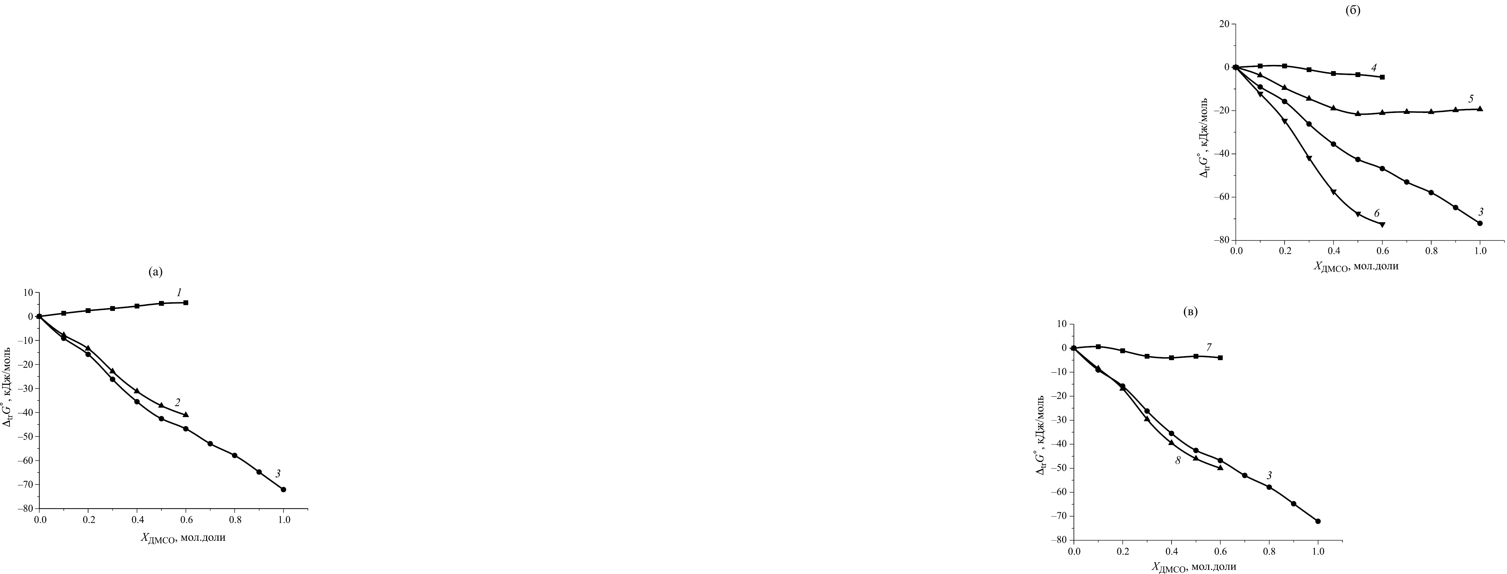 Рис. 3. Изменение энергии Гиббса реакций образования моноядерного (а), протонированного (б) и биядерного (в) комплексов никеля(II) с криптандом[2.2.2] и изменение энергии Гиббса переноса реагентов из воды в водно-диметилсульфоксидные смеси: 1 – ΔtrG°r1, 2 – (ΔtrG°([Ni[2.2.2]]2+) – ΔtrG°([2.2.2])), 3 – ΔtrG°(Ni2+), 4 – ΔtrG°r2, (ΔtrG°([NiН[2.2.2]]3+) – ΔtrG°([2.2.2])), 5 – ΔtrG°(Н+), 6 – (ΔtrG°([NiН[2.2.2]]3+) – ΔtrG°([2.2.2])), 7 – ΔtrG°r3, 8 – (ΔtrG°([Ni2[2.2.2]]4+) – ΔtrG°([Ni[2.2.2]]2+)).