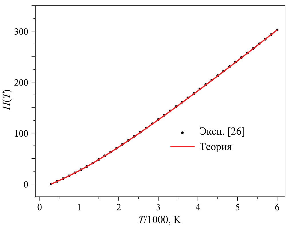 где необходимые величины даются соотношениями (12), (22) и (29). Для того чтобы результаты, полученные здесь, можно было сравнить с литературными данными, необходимо масштабированное значение молярной энтальпии. Масштабированная величина записывается как H(T) – H(298.15) [26], где H(298.15) обозначает молярную энтальпию, рассчитанную при 298.15 К и давлении 0.1 МПа.