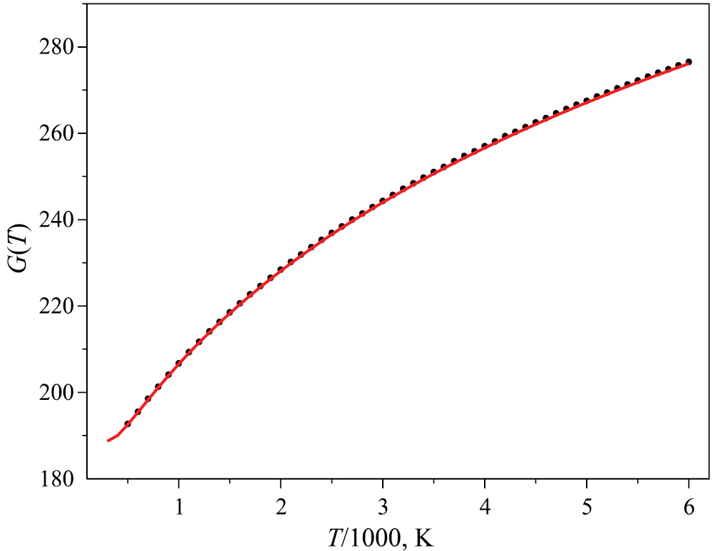 Рис. 6. Зависимость свободной энергии Гиббса –(G(T) – H(298.15))/T (Дж/(моль К)) от температуры в сравнении с экспериментальными данными [26].
