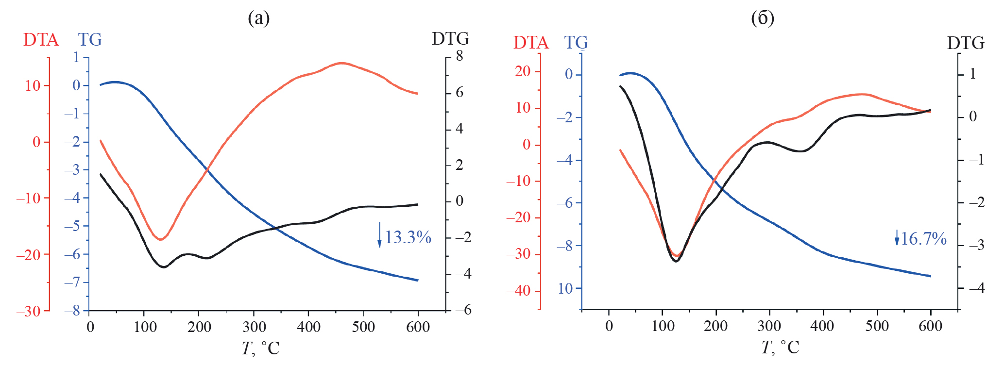 Рис. 1. Дериватограммы свежеприготовленных образцов, высушенных при 100°C: а) 3Zn/SiO2, б) 3Cu/SiO2.