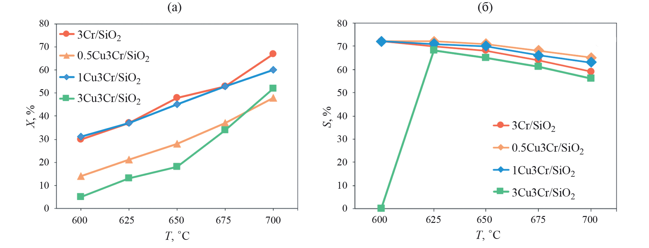 Рис. 5. Зависимости конверсии пропана (а) и селективности по пропилену (б) от температуры на образцах 3Сr/SiO2, 0.5Cu3Cr/SiO2, 1Cu3Cr/SiO2, 3Cu3Cr/SiO2.