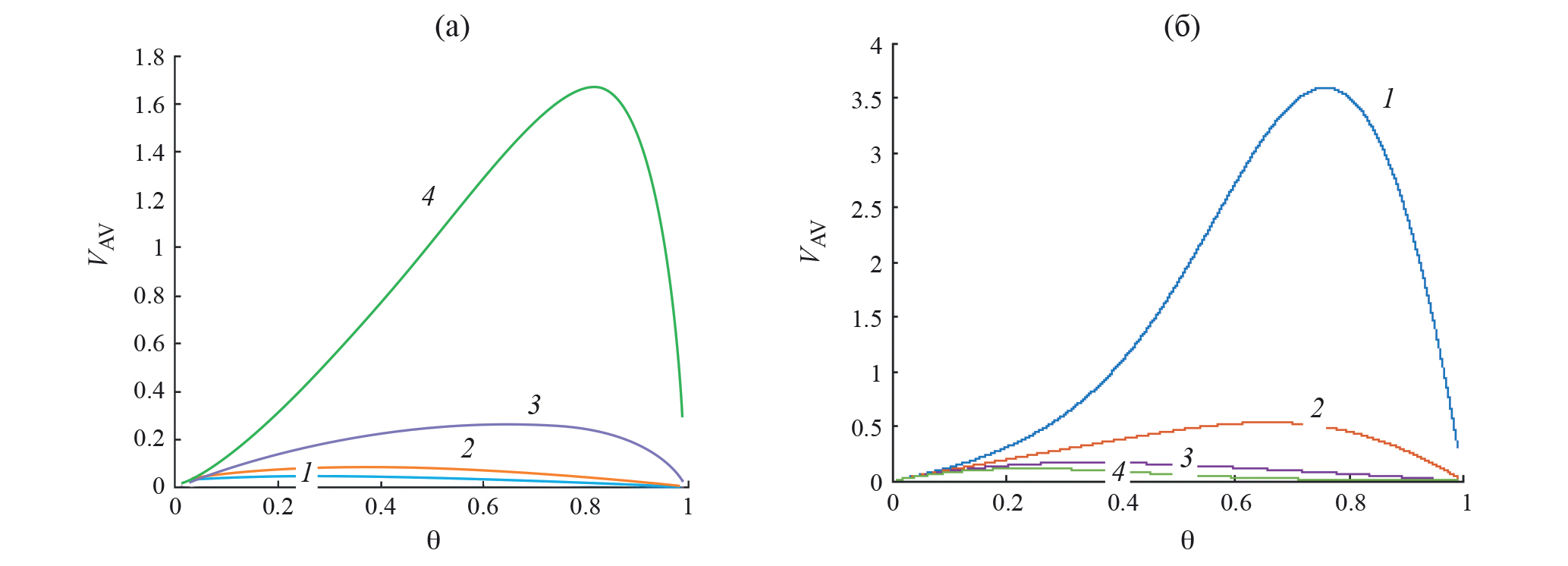 Рис. 1. Концентрационные составляющие скоростей VAV, рассчитанные в КХП для притягивающихся (а) и отталкивающихся (б) частиц при τ = 1.2: α = 0 (1), 1/3 (2), 2/3 (3), 1 (4) в зависимости от степени заполнения решетки θ.