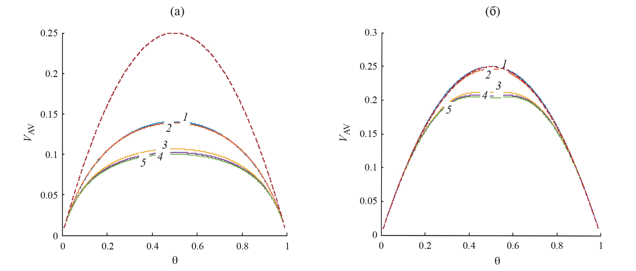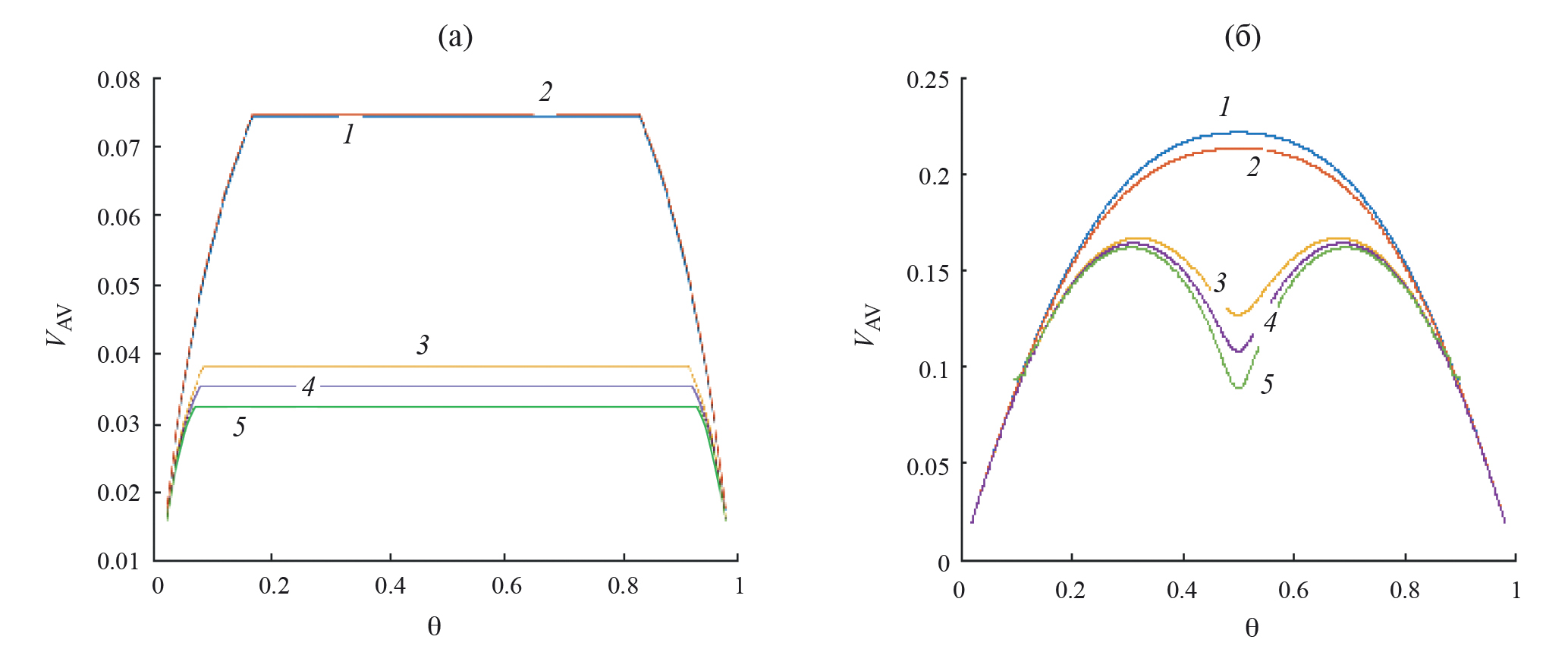 Варьирование параметра α представлено на рис. 4. Для притягивающихся частиц увеличение α смещает положение максимума зависимости VAV(θ ) от меньших значений θ к большим (а), тогда как для отталкивающихся частиц максимум с ростом α смещается от больших значений θ к меньшим (б).