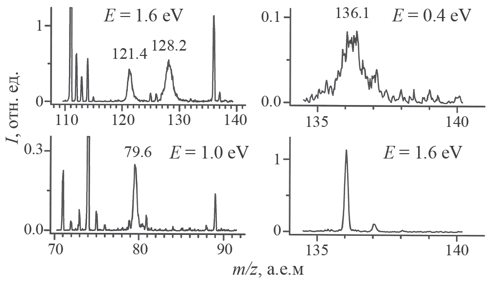 Эксперимент выполнен на магнитном масс-спектрометре МИ-1201В (СССР, 1987 г.), модифицированном для работы с отрицательными ионами [10]. Вкратце, электроны, эмитируемые катодом, проходят через камеру ионизации, где взаимодействуют с парами образцов, что приводит к образованию отрицательных ионов. Последние извлекаются из камеры, формируются в пучок, ускоряются, масс-анализируются, регистрируются вторично-электронным умножителем. Управление энергией электронного пучка осуществляется компьютером, в который синхронно заносится регистрируемый ионный сигнал. Для калибровки шкалы электронной энергии мы использовали максимумы кривых эффективного выхода ионов SF6–/SF6 (~0 эВ) и [M–H]–/CH3COOH (~1.55 эВ [11]). Энергии появления осколочных ионов (см. табл. 1) определялись относительно энергии появления SF6–/SF6 (~0 эВ). Методика определения сечения образования фрагментных отрицательных ионов описана в работе [12].