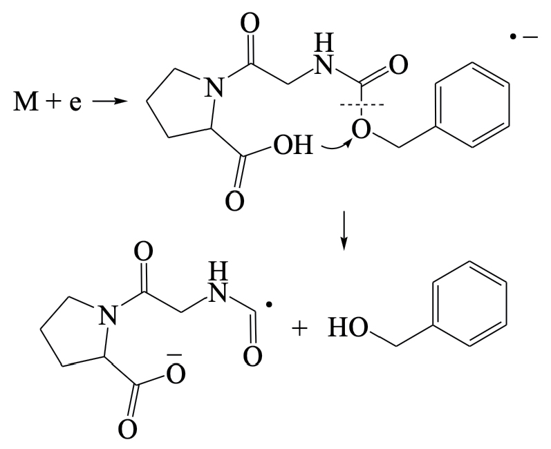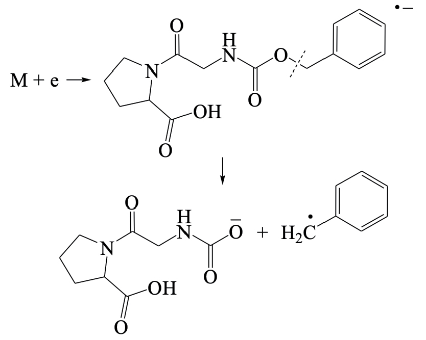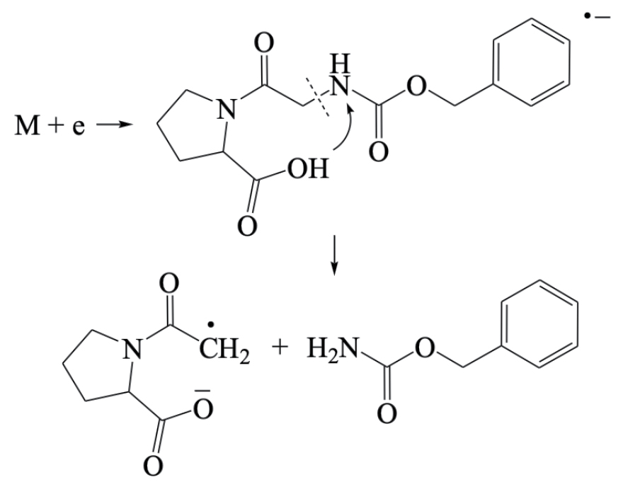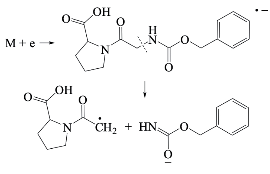 В результате проведенных исследований электронно-индуцированных реакций в модифицированном дипептиде N-бензилоксикарбонил-глицил-L-пролине была установлена их идентичность с реакциями в других ранее исследованных олигопептидах в аналогичных условиях. Распад молекулярных ионов в низкоэнергетической области осуществляется по большему числу каналов и с большей эффективностью, чем в высокоэнергетической области. Эти распады представляют собой реакции Н-сдвига, поскольку протекание многих реакций простого разрыва связей затруднено по энергетическим причинам. Перегруппировочный механизм заключается в миграции подвижного атома водорода СООН-группы к одному из радикальных центров, возникающих при разрыве внутренних связей в молекулярном ионе, что обусловлено возможностью образования низкоэнтальпийных ионов с карбоксильной структурой. Отличительной особенностью процессов в N-бензилоксикарбонил-глицил-L-пролине является выделение сверхинтенсивного иона с карбоксильной структурой депротонированного глицилпролина. Эта реакция заключается в последовательной фрагментации молекулярного иона, инициируемая выбросом бензильного фрагмента с последующим Н-сдвигом в промежуточном ионе и его декарбоксилированием.