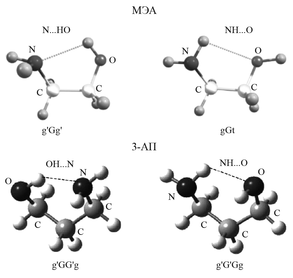 Рис. 1. Наиболее стабильные конформеры молекул МЭА и 3АП в газовой и жидкой фазах [4, 5]. Подчеркнем, что это гош-конформеры.