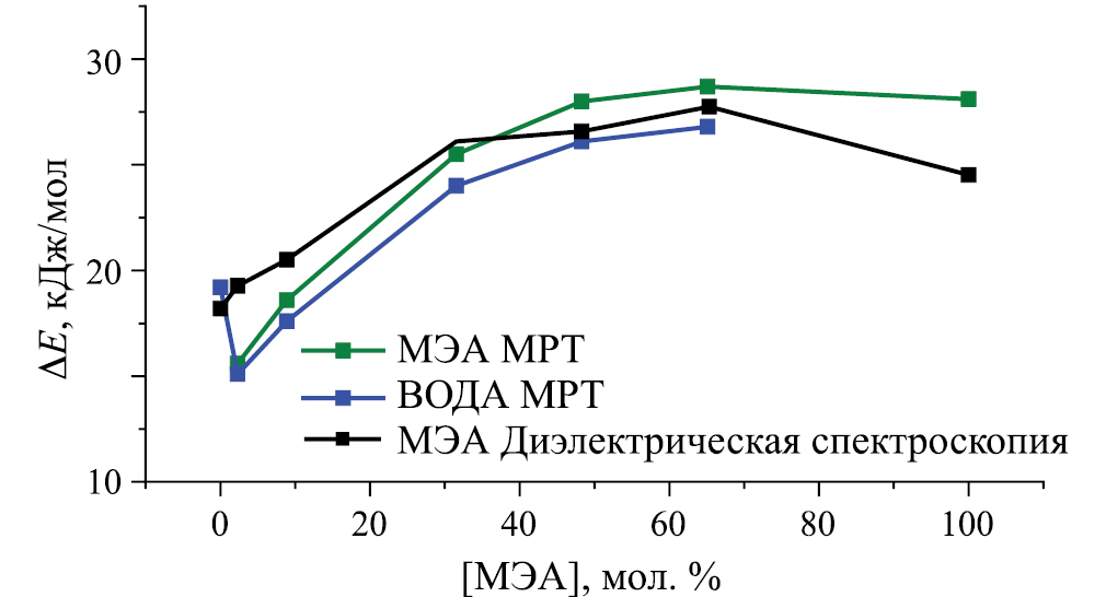 В системе Н2О–МЭА поступательное и вращательное движения связаны. Имеют почти одинаковую энергию активации вплоть до 70 мол. % МЭА. Это можно объяснить либо смешанной сеткой Н-связей из-за тетраэдрической направленности водородной связи в воде и в МЭА, либо образованием ассоциата МЭА·2Н2О, конгруэнтно плавящегося при 238К, и ассоциата МЭА·Н2О, инконгруэнтно плавящегося при 248К [7], либо всеми перечисленными образованиями вместе, переходящими друг в друга.