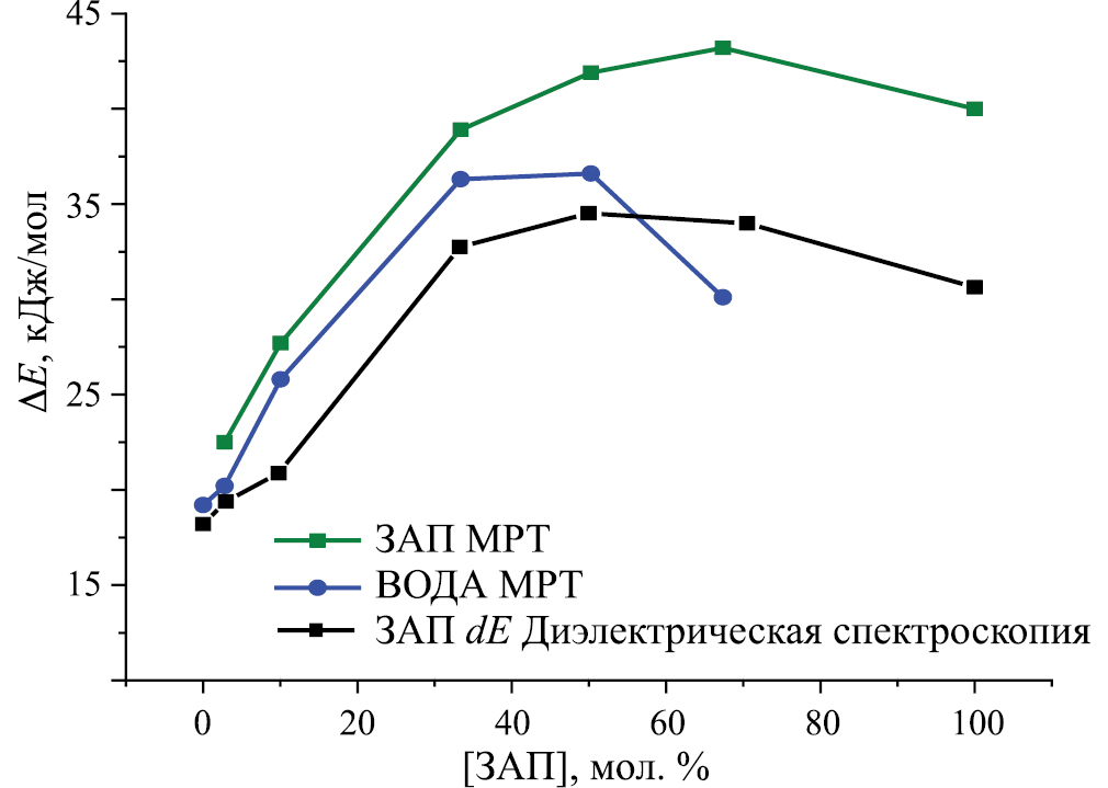 На рис. 2, 3 к имеющимся на них концентрационным зависимостям энергий активации трансляционной подвижности молекул воды и аминоспиртов мы добавили результаты работы [19] по концентрационной зависимости энергий активации диэлектрической релаксации в исследованных системах. Из рисунков видно, что добавленные кривые повторяют зависимости энергий активации трансляционной подвижности молекул именно аминоспиртов, а подвижностей молекул воды до 65 мол. % МЭА (рис. 1) и до 33 мол. % 3АП (рис. 2). Из приведенного анализа представленных рисунков можно сделать следующие выводы.