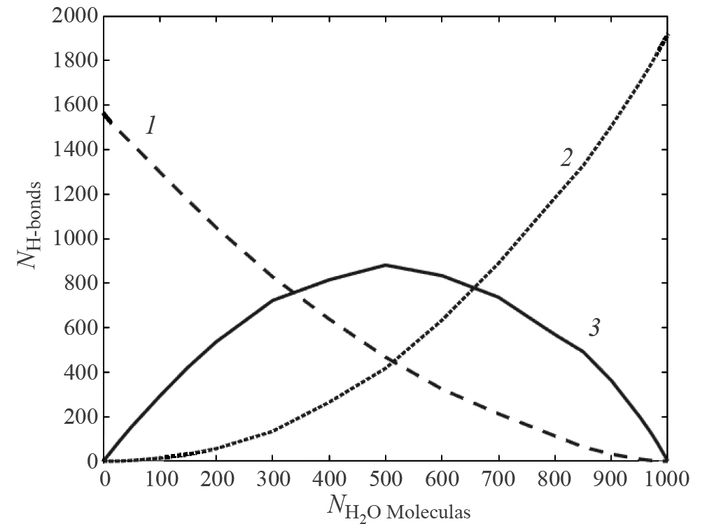 Рис. 4. Среднее количество водородных связей в структуре, связывающих различные пары молекул: количество пар молекул 3АП изображено пунктирной линией (1), количество пар молекул воды – линией, состоящей из точек (2), сплошная линия (3) – это количество водородных связей между молекулой 3АП и воды.