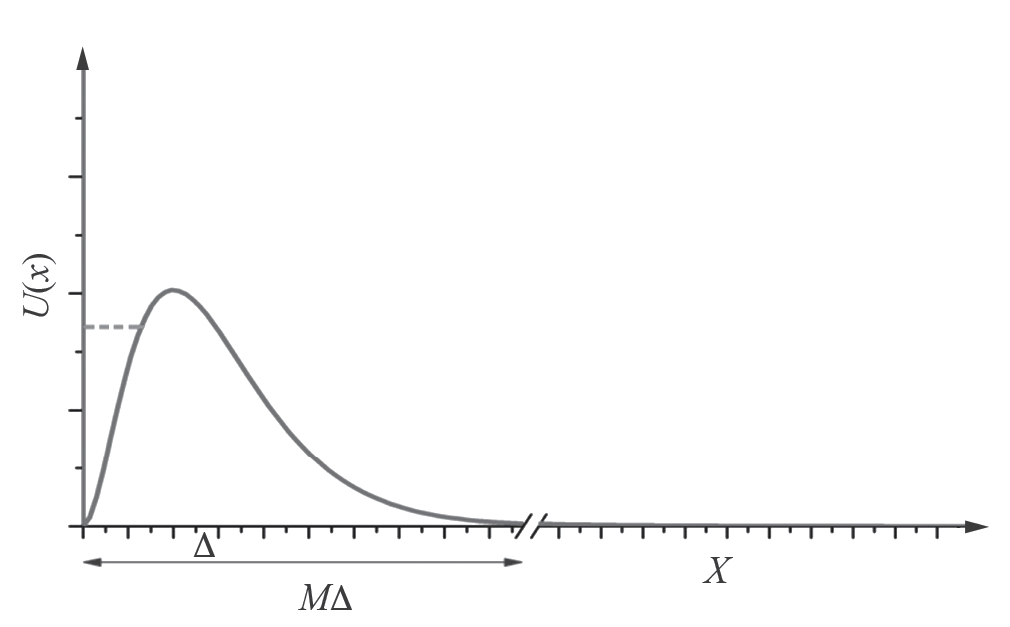 Будем считать, что барьерный потенциал U(x) (см. рис. 1) не зависит от времени и быстро затухает. Таким образом, мы можем рассматривать его как потенциал конечного радиуса действия, т. е. локализованный в интервале первых M узлов сетки, если М достаточно велико. Следующие N узлов отвечают области свободного движения и N может расти неограниченно. Другими словами, предполагается, что область [0, M∆] отвечает локализации потенциала, а оставшаяся часть сетки [(M+1)∆, N∆] – асимптотической области, где ∆ – шаг регулярной сетки.