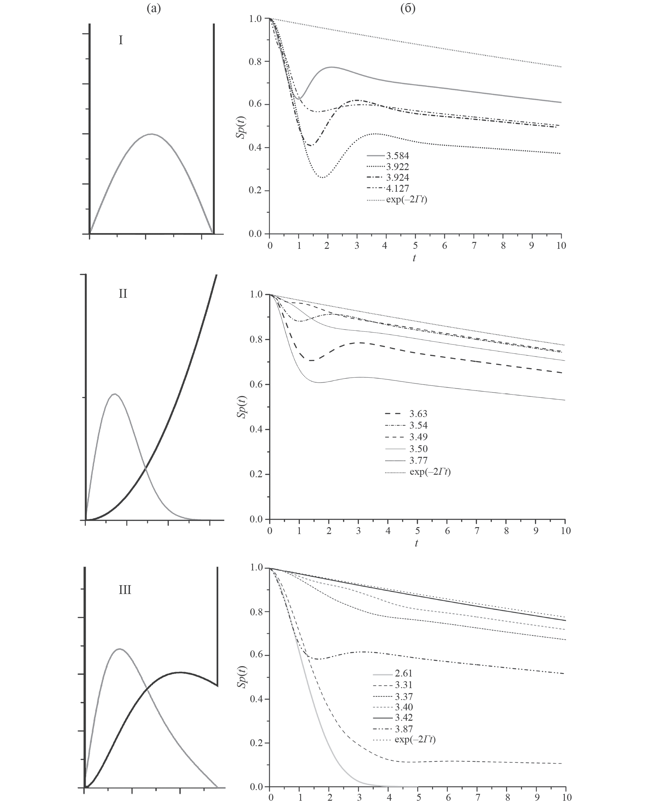 Рис. 3. Различные начальные состояния (а) и SP(t) для них (б). На левой панели жирной черной линией показан потенциал, серой сплошной линией – соответствующая этому потенциалу собственная функция, используемая как начальное состояние. Кривые на правой панели маркированы средней энергией соответствующего начального состояния.