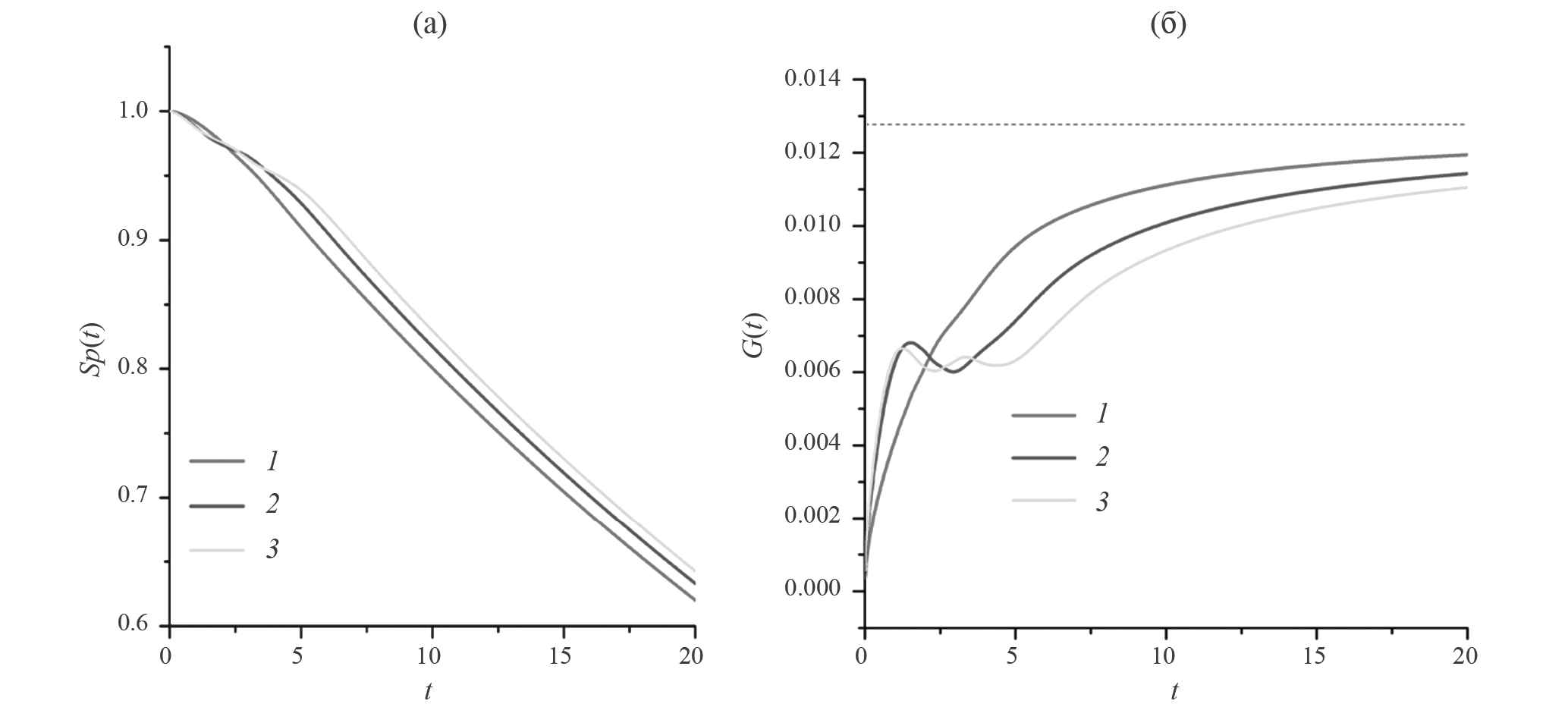 Рис. 5. Распад резонансного состояния (решения задачи(1)). Зависимости SP(t) (а) и G(t) = – ln(SP(t))/(2t) (б) показаны сплошной линией. Пунктиром на левой панели показана функция exp(–2Гt), а на правой – полуширина Г резонансного состояния (2). Ось абсцисс – время в а. е.