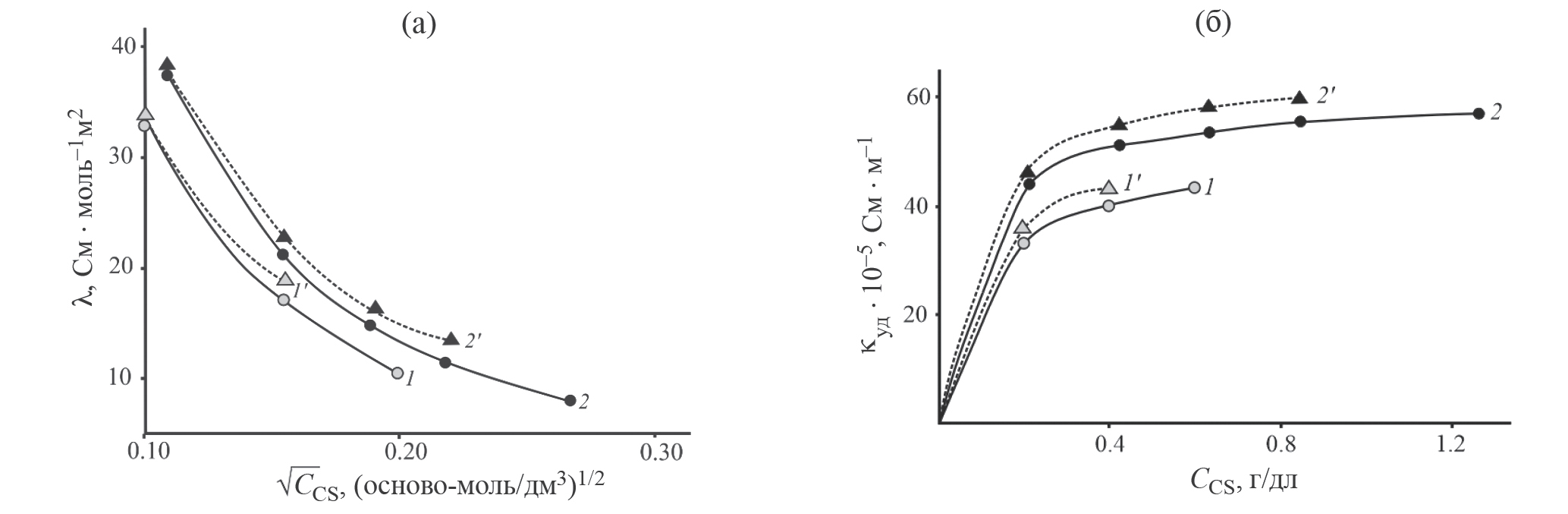 Рис. 2. Концентрационные зависимости эквивалентной (а) и удельной электропроводности (б) свежеприготовленных водных растворов CS в L-AspА (1, 2) и D-AspА (1ʹ, 2ʹ) с САspА = 0.4 (1, 1ʹ) и 0.8 г/дл (2, 2ʹ).