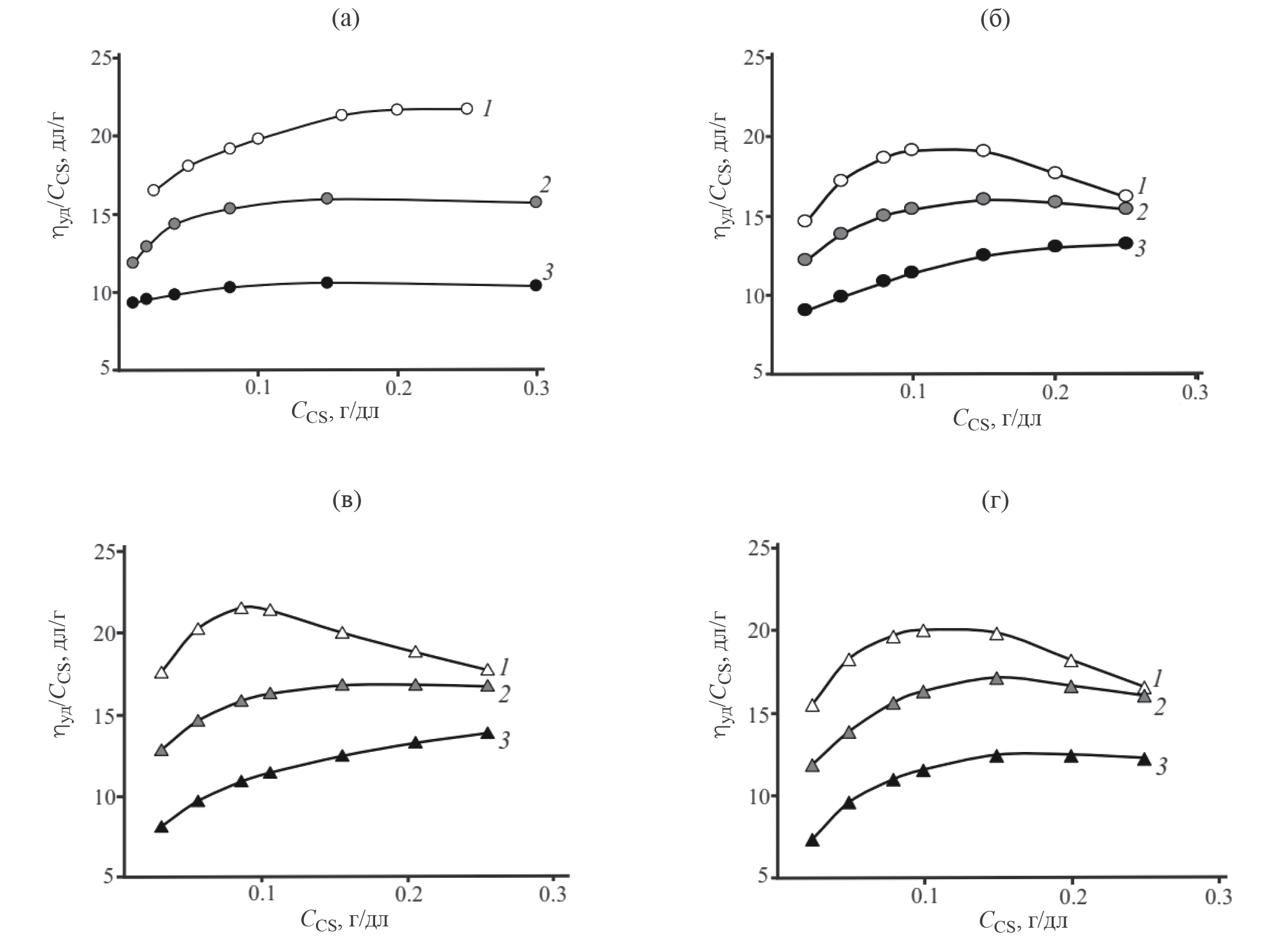 Рис. 3. Концентрационные зависимости числа вязкости водных растворов CS в L-AspА (а, б) и D-AspА (в, г) с САspА = 0.2 (1), 0.4 (2) и 0.8 г/дл (3): свежеприготовленных (а, в) и через 4 сут хранения (б, г).