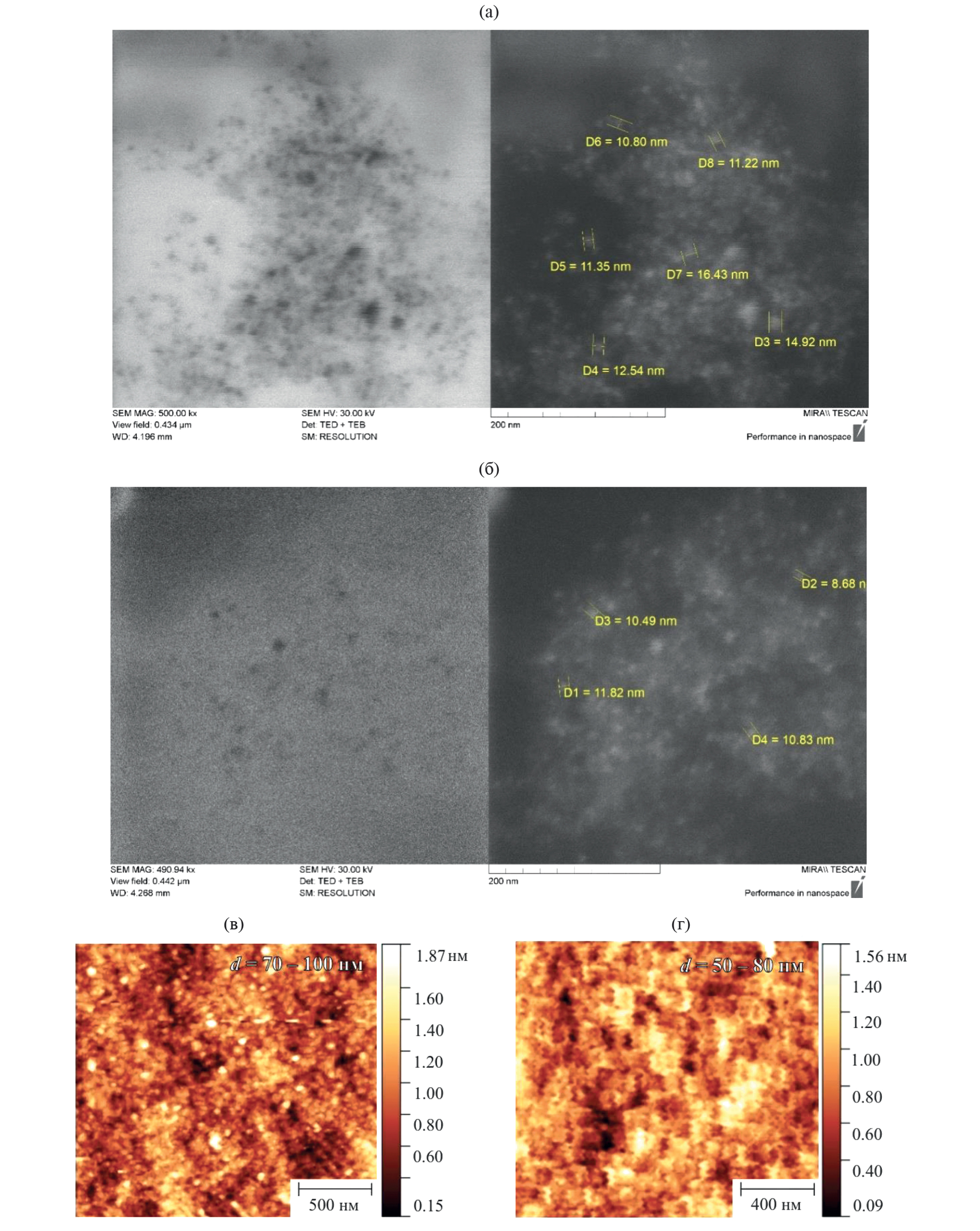 Рис. 4. СЭМ- (а, б) и АСМ-изображения наночастиц (в, г), выделенных из свежеприготовленных растворов CS в L-AspA (а) и D-AspA (б) с СCS = 0.25 г/дл и САspА = 0.4 г/дл.