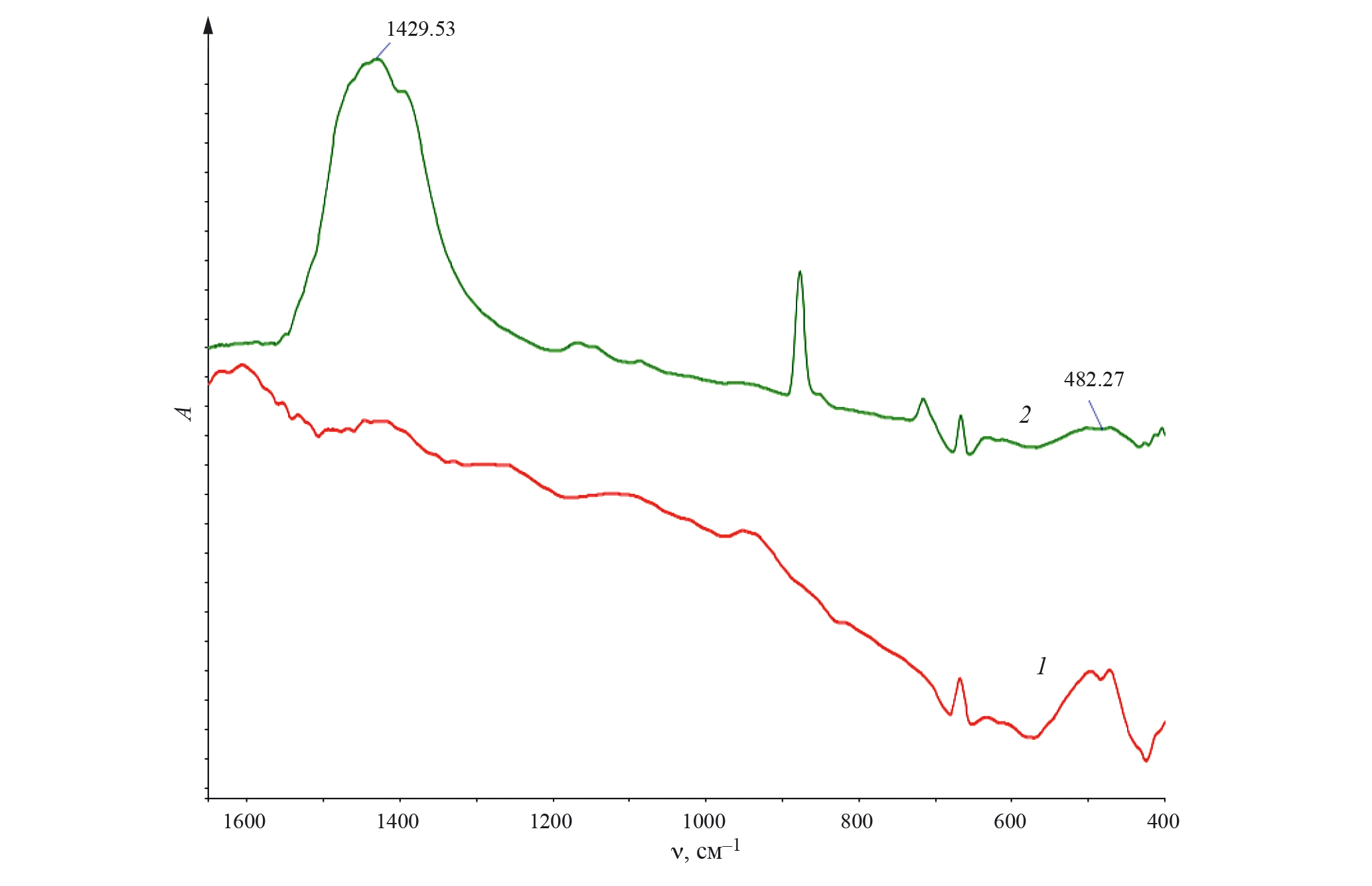 Рис. 1. ИК-спектры изначальной поверхности никеля (1) и после травления (2).