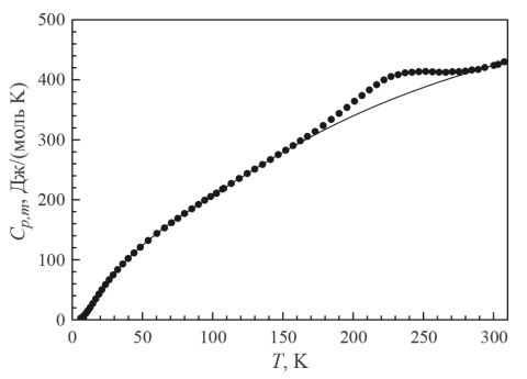 Измерение теплоемкости. Теплоемкость образца была измерена в интервале от 6.088 до 307.596 K адиабатическим методом. Вакуумный адиабатический калориметр был изготовлен в ИНХ СО РАН и описан ранее [17, 18]. Надежность калориметрического прибора была подтверждена измерениями теплоемкости меди и бензойной кислоты [17–19]. Относительные отклонения полученных данных от рекомендуемых [20, 21] составили: менее 0.9% – при Т < 20 К, менее 0.23% – при Т > 20 К.