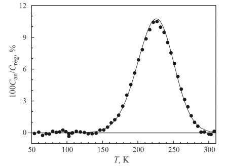 Регулярное поведение теплоемкости в области аномалии (Creg, рис. 1) было рассчитано с помощью уравнения (1) по полученным в результате аппроксимации параметрам. Аномальная часть теплоемкости Сan (рис. 2) была получена как разность между экспериментальными значениями Cp,m и вычисленной Creg. Как видно на рис. 2, аномалия в максимуме при Т ≈ 225 K достигает ≈11% (рис. 2) от регулярного поведения теплоемкости.