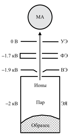 Рис. 1. Схема ионного источника; ВЭ – вытягивающий электрод, ФЭ – фокусирующий электрод, УЭ – ускоряющий электрод, МА – масс-анализатор.