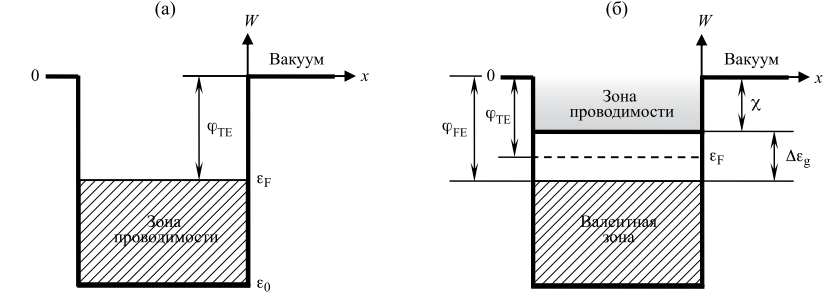 Формула (1) выведена с использованием распределения Ферми–Дирака, и в ней ϕTE = ε0 – εF (ε0 – дно потенциальной ямы, в которой находится электрон в твердом теле), так что определения 2 и 4 следует считать идентичными. По-видимому, термоэлектрическая РВ – единственная энергетическая характеристика связи электрона с кристаллом, доступная измерению и имеющая термодинамический смысл. Далее мы будем под РВ подразумевать именно эту величину и обозначать ее посредством ϕ.