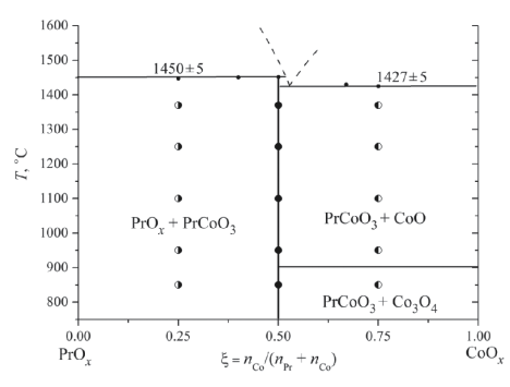 Температуры плавления образцов в системе PrOx – CoO определяли методом визуально-политермического анализа с использованием платино-платинородиевой термопары (ПП-1).