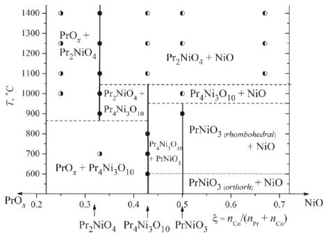 Система PrOx – CoOx – NiO. Ранее в литературе были описаны некоторые твердые растворы при частичном замещении кобальта и никеля друг на друга. Имеется информация об оксидах со структурой перовскита PrCo1–xNixO3–δ с содержанием никеля х = 0.4 [24], х = 0.5 [16, 20], х = 0.6 [18], 0 ≤ x ≤ 0.7 [40], хотя не во всех работах обозначены условия приготовления. Со стороны никелатов со структурой типа Раддлесдена–Поппера описаны оксиды Pr4Ni3–yCoyO10–δ c у = 0.3 [25, 41] и Pr2Ni1–yCoyO4+δ, c y = 0.1–0.2 [14, 15, 21, 22]. Значения границ областей гомогенности существующих твердых растворов, которые, несомненно, зависят от температуры, на сегодняшний день не определены.