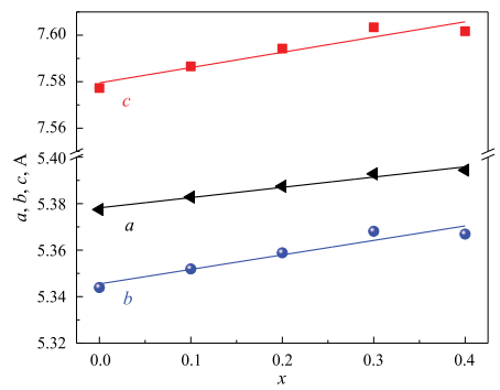Рис. 3. Параметры элементарной ячейки PrCo1–xNixO3 при различном содержания никеля (x).